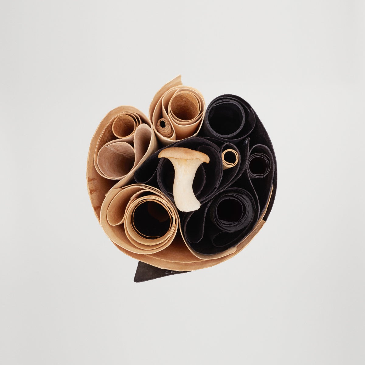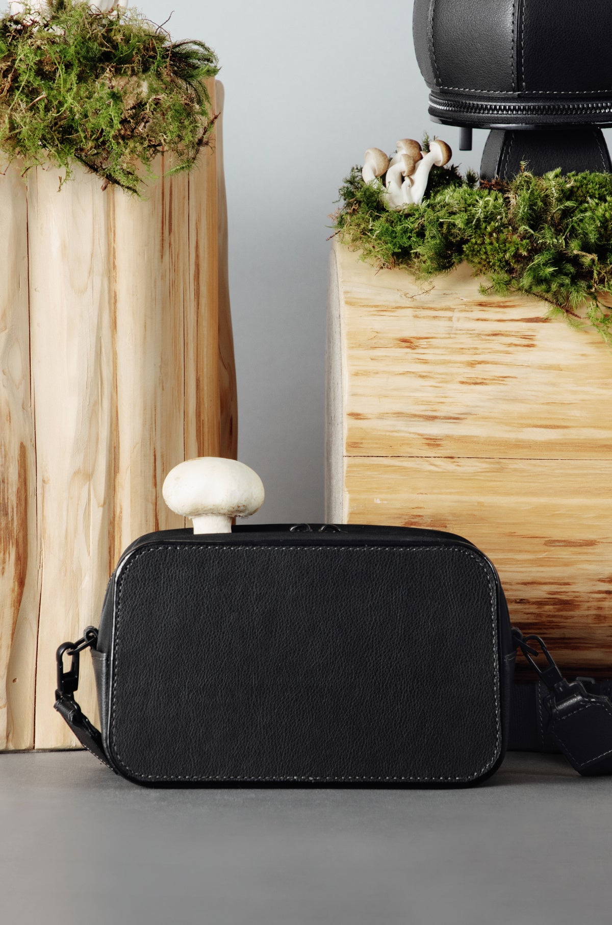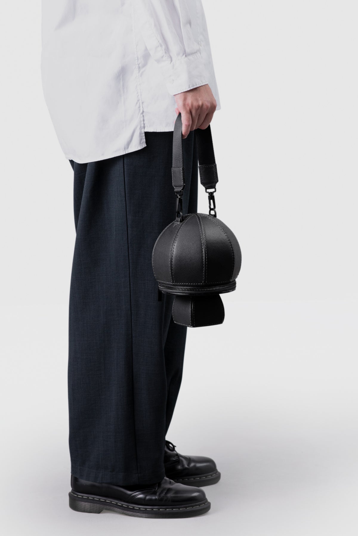 キノコ由来の新素材「Mylo™」をキノコの形に仕立てた、「持つ楽しさ」が溢れるアイコニックなハンドバッグです。球体のシルエットを平面のパーツで構成することで、キノコ形の愛らしさにモダンな印象をプラス。メイン収納の傘部分は最小限の小物が入れられ、「柄」部分はアクセサリーなどをしまえるポケットになっています。ファスナーなども黒系で統一し、アクセサリー感覚でコーディネートできる洗練された雰囲気です。
