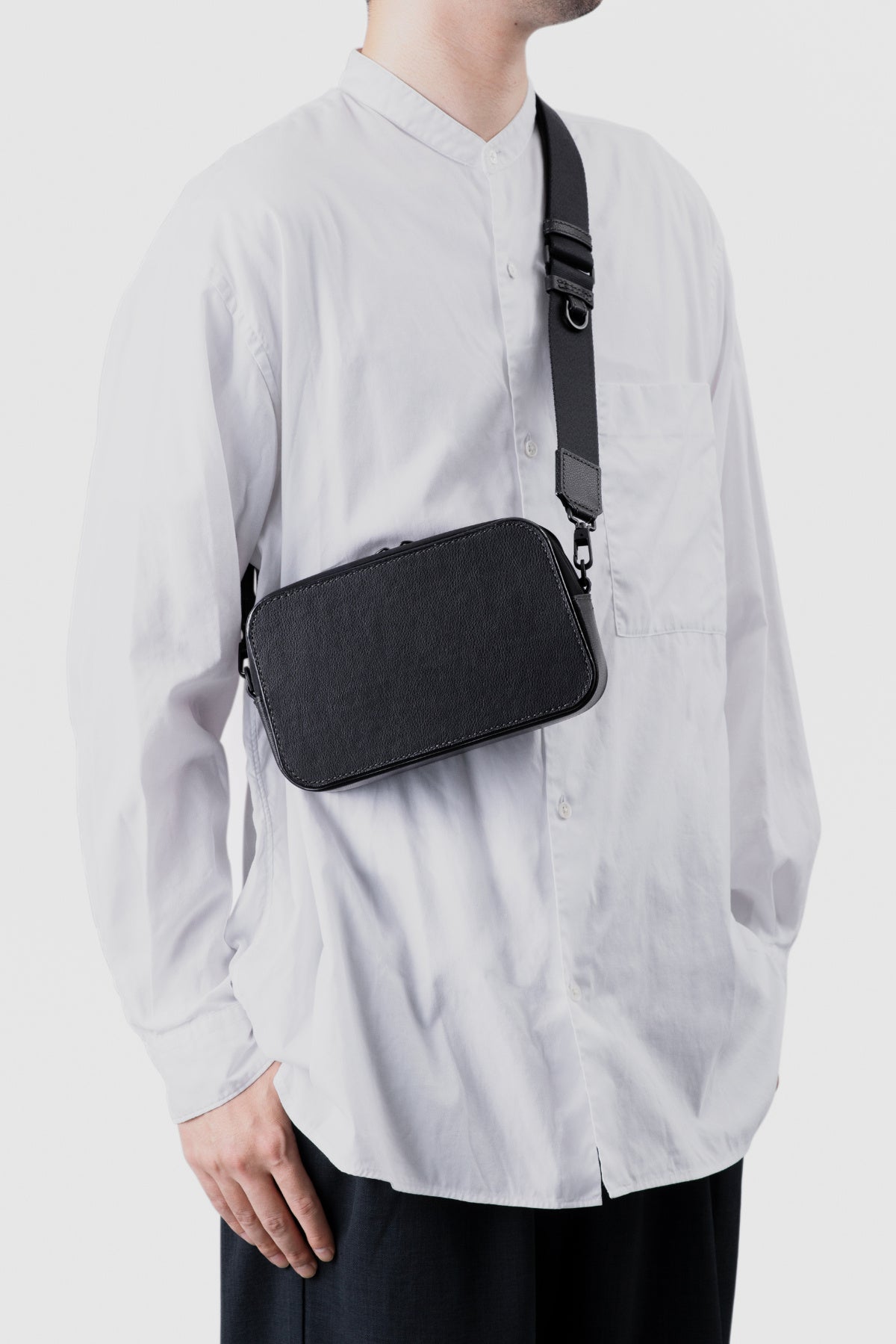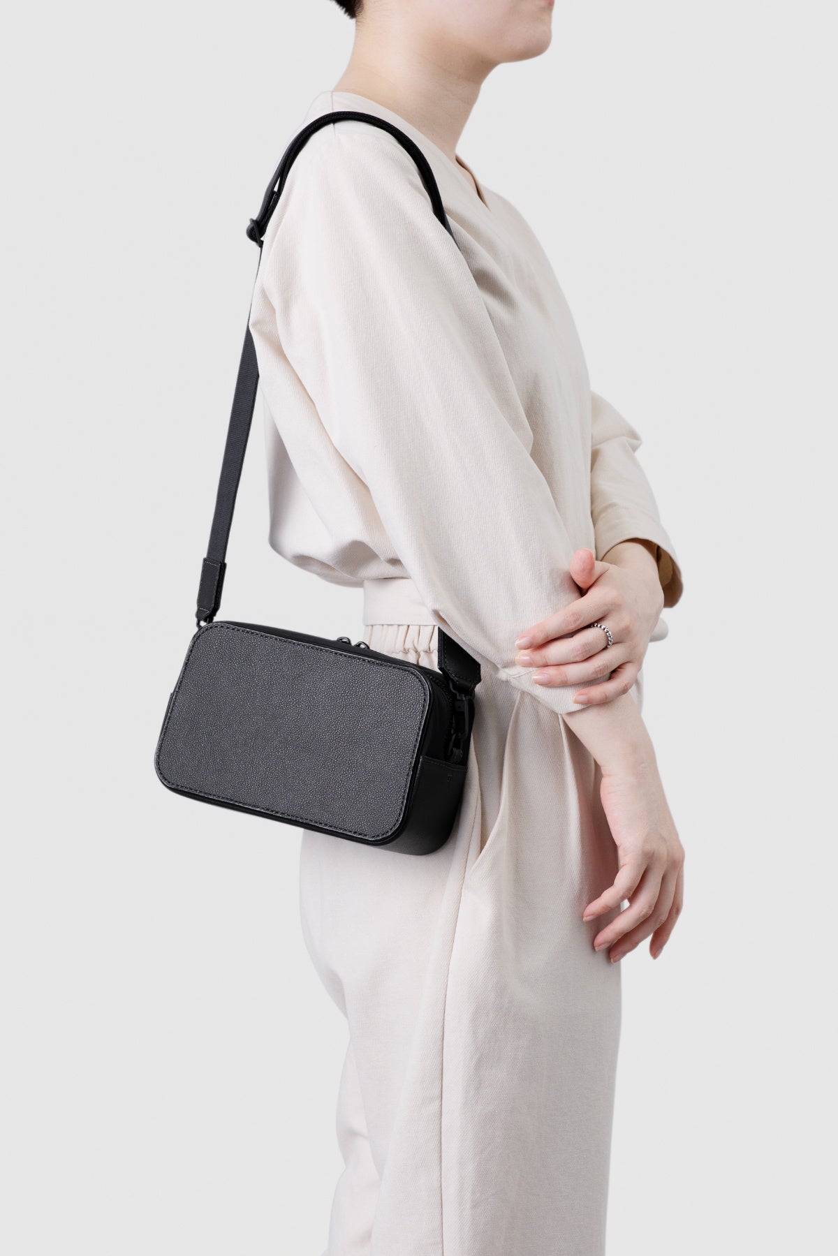「Mylo™」を持つ楽しさを贅沢に堪能できる、シンプルなデザインのショルダーです。気軽に持てるサイズ感と装いに合わせやすいブラックで統一した配色で、幅広くご使用いただけます。ナイロン生地とのコンビネーションはモダンで上品な印象に。ショルダーベルトの接続がフレキシブルなので、ボディーバッグのように使えます。