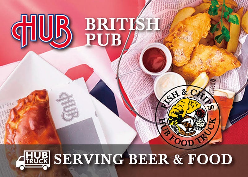 英国PUB HUBのBeer&Foodトラックです。オリジナルクラフトビール[HUBエール]と[Tea モクテル]、英国ソウルフード[Fish&Chips][コーニッシュ風パスティ]を中心に、本場を凌ぐ価値を求めて、幅広く楽しんで頂くためリーズナブルにご提供しております。