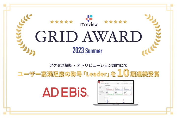 アドエビス、「ITreview Grid Award 2023 Summer」のアクセス解析・アトリビューション部門でユーザーの満足度・認知度が優れた製品に贈られる「Leader」を10期連続受賞
