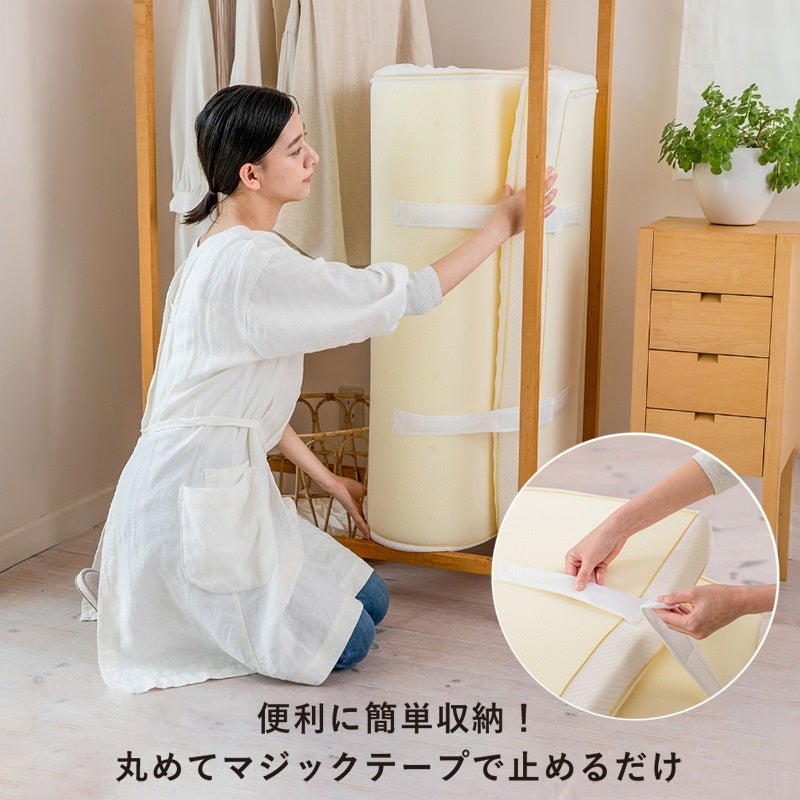 腰の凝りやすい方におすすめのマットレス。点で支えて負荷を軽減するフレキシブル構造で腰をやさしくサポートします。マットレスに設けたエアーホールでムレを軽減します。ベルトで巻いてコンパクトに収納できる丸巻きタイプ。側生地は大きく開くL字ファスナーを採用し、外してご家庭でお洗濯していただけます。