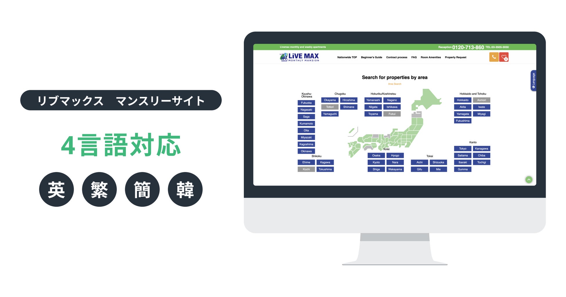 Wovn Technologies株式会社(以下 WOVN)が提供する Web サイト多言語化ソリューション『WOVN.io(ウォーブン・ドットアイオー)』が、株式会社リブ・マックス(本社:東京都港区、代表取締役:有山 憲、以下 リブマックス)が運営する、都市型レジデンス系マンスリーマンションを紹介するマンスリーマンションリブマックス(以下、マンスリーサイト)に導入され、4言語公開が開始されました。これにより、日本滞在を予定している外国人利用者が、利用シーンや希望期間に合わせた物件探しをご自身で行えるようになります。