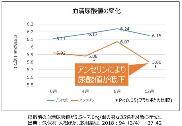届出表示:本品にはアンセリンが含まれます。アンセリンには尿酸値が高め(尿酸値5.5~7.0mg/dL)の方の尿酸値を下げる機能が報告されています。 (機能性関与成分に関する研究レビュー)