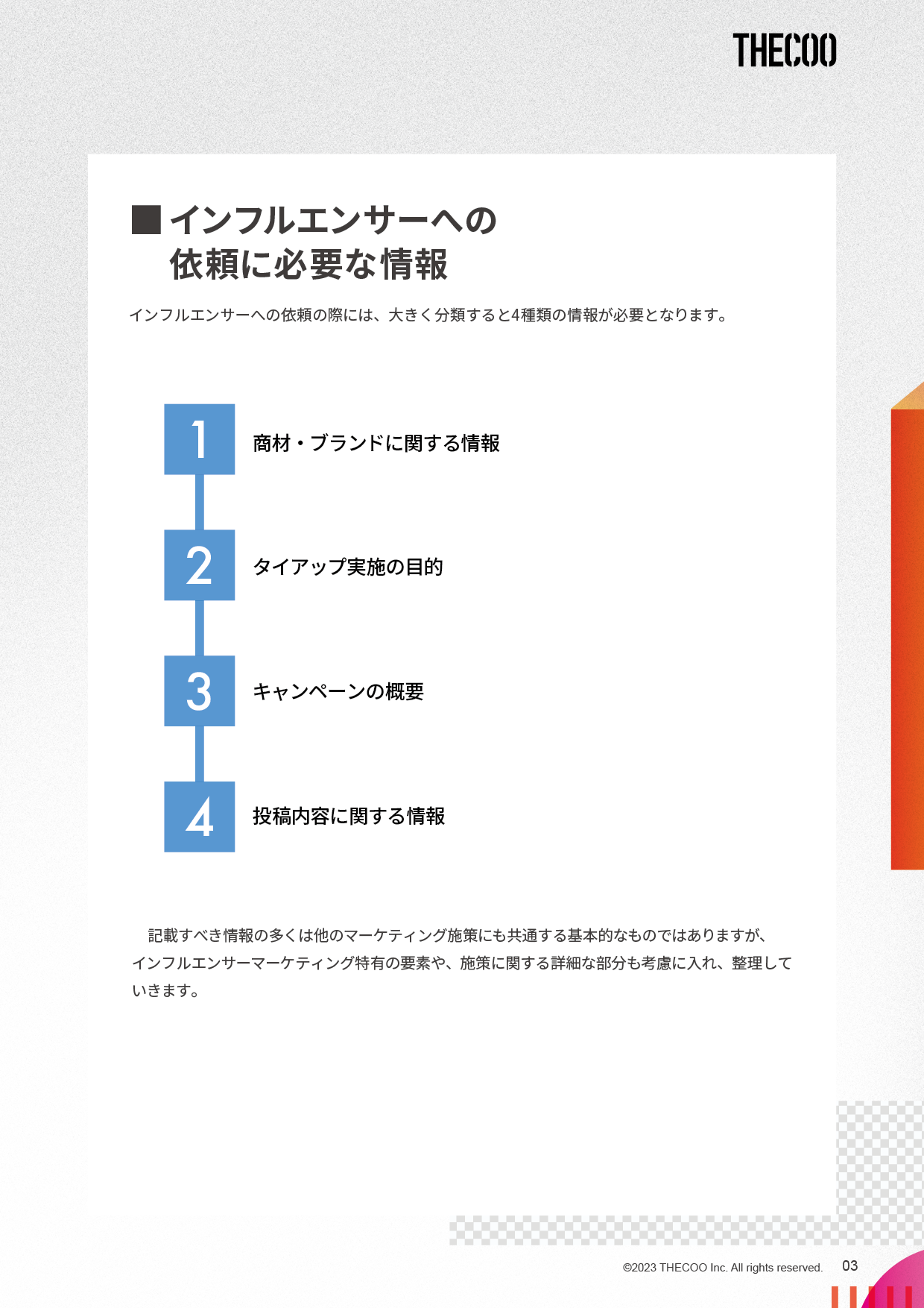 インフルエンサーへの依頼の際には、大きく分類すると4種類の情報が必要となります。記載すべき情報の多くは他のマーケティング施策にも共通する基本的なものではありますが、インフルエンサーマーケティング特有の要素や、施策に関する詳細な部分も考慮に入れ、整理していきます。