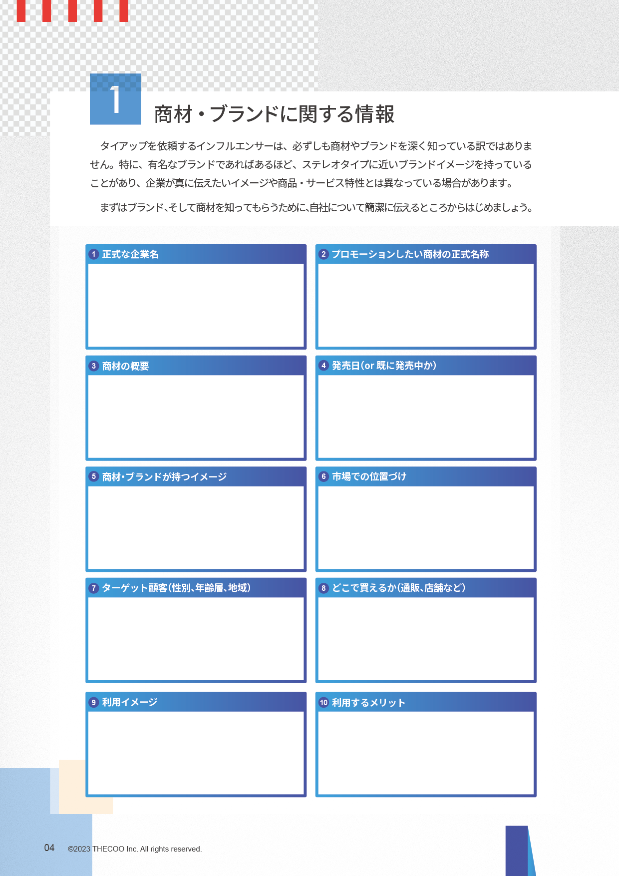 本資料は、インフルエンサーマーケティングを実施する際に、インフルエンサーや事務所、代理店に伝えるべき与件情報を整理するためのテンプレートです。このテンプレートを使うことで、コミュニケーションの一助となれば幸いです。