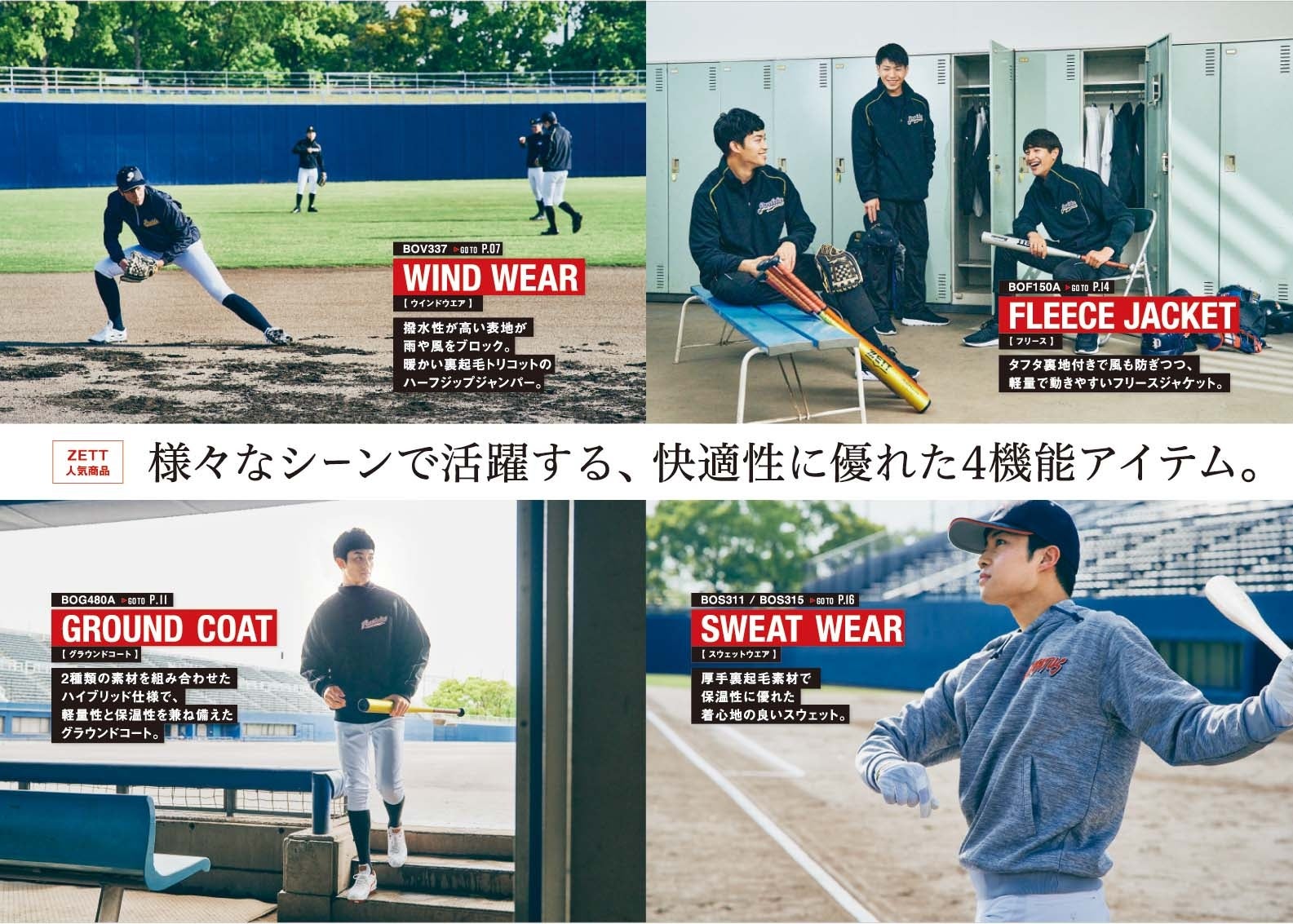 【2023-2024 FALL&WINTER ベースボールアパレルカタログ】は、巻頭ページでチームで揃えるFALL&WINTERアパレルの代表4アイテム「ウインドウエア」「グラウンドコート」「フリースジャケット」「スウェットウエア」を各アイテムの特徴を使用シーンを用いて紹介、どのような商品か分かりやすく伝わるようにしております。