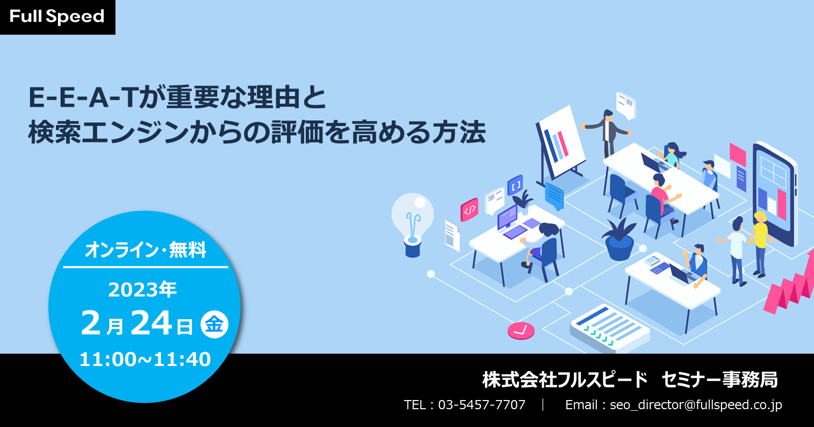 インターネットマーケティング支援を行う株式会社フルスピードは、「E-E-A-Tが重要な理由と検索エンジンからの評価を高める方法」と題した無料オンラインセミナーを2023年2月24日(金)に開催いたします。