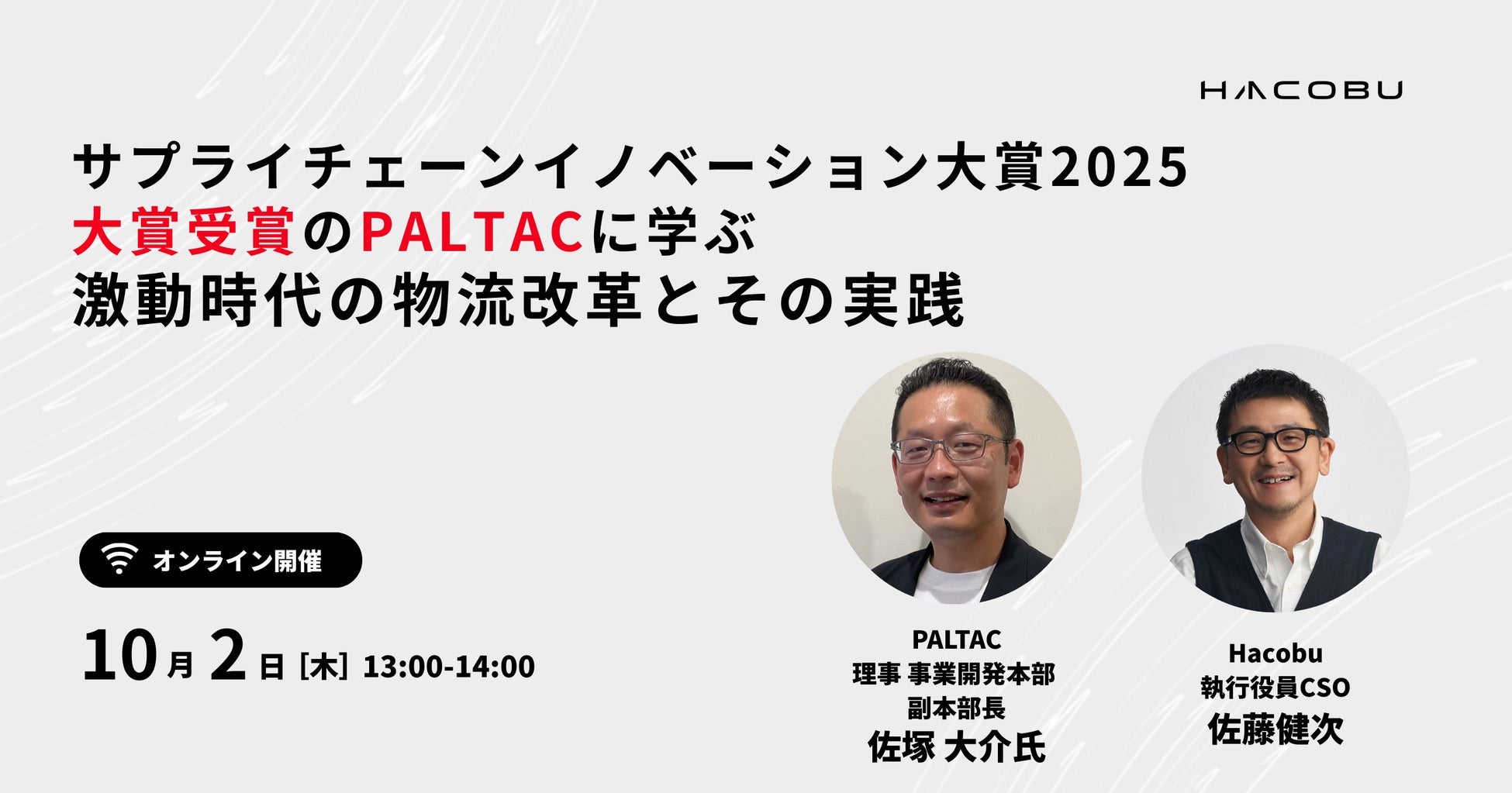 データで物流課題を解決する株式会社Hacobuは、2025年10月2日、「サプライチェーンイノベーション大賞2025大賞受賞のPALTACに学ぶ、激動時代の物流改革とその実践」と題しオンラインセミナーを開催いたします。