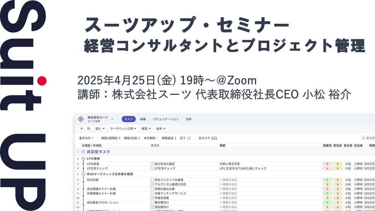 株式会社スーツ(所在地:東京都千代田区、代表取締役社長CEO:小松 裕介)は、2025年4月25日(金)19時から、当社代表の小松が講師を務めるスーツアップ・セミナー「経営コンサルタントとプロジェクト管理」を無料開催します。