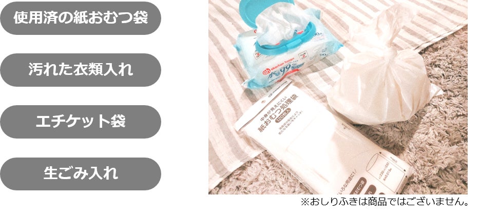 外出先ではおむつをすぐに廃棄することは困難であり、臭いのするおむつを持ち運ぶ状況が多々あります。本商品はそうした困りごとを解決し快適なおむつ替えをサポートします。気になる臭いを軽減するのはもちろん、中身が見えにくい半透明の袋によりおむつ処理袋以外の用途としてもご利用いただけます。
