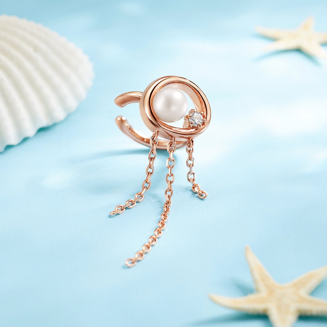 貝殻やくらげなど、幸運を呼ぶ海辺の仲間たちをモチーフにしたキャッチーなシリーズも。ピンクゴールドカラーの地金をベースに、ポイントでパールをあしらうことで、日常に取り入れやすい耳周りジュエリーに落とし込みました。ブレスレットには、イルカやヒトデ、カメのチャームをセッティングし、Canal4℃らしいキュートな印象に。夏ならではのジュエリーとともに忘れられない特別な思い出を作ってみては。