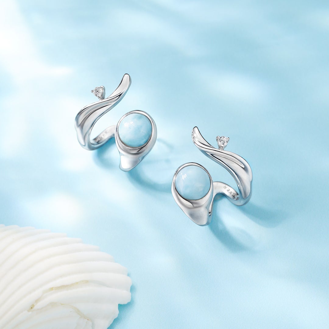 南国の水面を思わせる、美しい色合いや模様が特徴のラリマーをメインにあしらったネックレスやピアスが登場。波をイメージしたゆるやかなラインのシルバーカラーの地金が、涼しげな印象を与えてくれる夏にぴったりなデザインです。イルカのヒレを象った、遊び心を閉じ込めたデザインは、夏へのときめきをさらに加速させてくれるはず。さらに、ローズカットを施したラリマーが光に反射して水面のような煌めきを放つネックレスとピアスも。世界三大ヒーリングストーンともいわれる特別な石に、癒しのパワーをもらって。