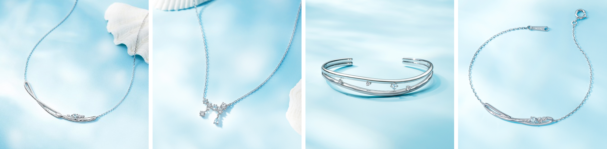 地金の細かなテクスチャーとブルーのカラーストーンのグラデーションで、波打ちを表現したシリーズ。彩度の異なるブルートパーズが水しぶきの煌めきを思わせるさわやかなデザインです。薄着の季節にぴったりな、ボリューム感のある主役級のネックレスやブレスレット、バングルを揃えました。