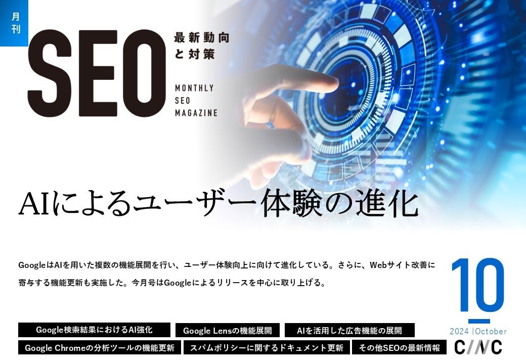 株式会社CINC(本社:東京都港区、代表取締役社長:石松友典、以下CINC)は、毎月特定のテーマのSEO最新動向と対策についてレポートする「月刊SEO」の10月号を公開しました。