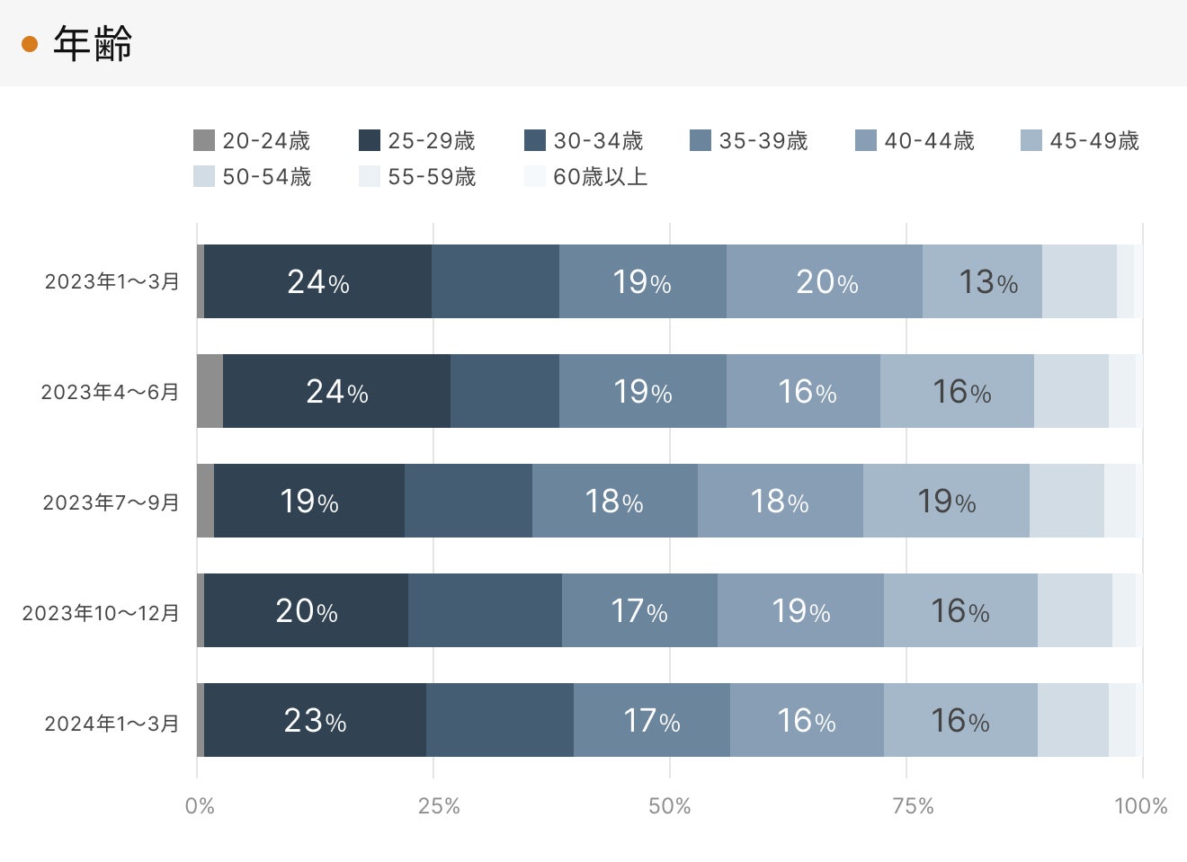 2024年1〜3月度における成約顧客の年齢は、 25〜29歳の23%が最も割合の多い年齢帯となりました。 次に多い割合は35〜39歳の17%、続いて40〜44歳ならびに45〜49歳の16%でした。