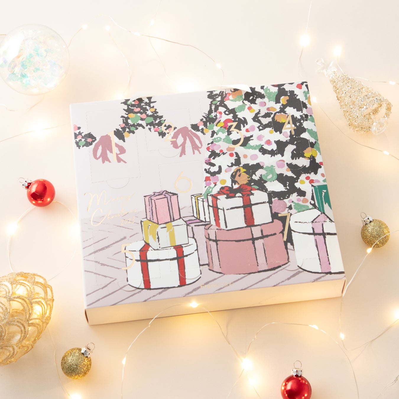 Francfrancで人気のアイテムから、限定デザインまで詰め込んだボリューム感のあるアドベントカレンダーです。12月1日からクリスマスまでの日付を刻んだボックスの中には、定番のルームフレグランス、メイクブラシ、入浴剤や、限定デザインのボディクリーム、リップバームや練香水を詰め込みました。クリスマス気分を盛り上げる今年だけのFrancfrancオリジナルパッケージをお部屋にディスプレイすれば、ホリデーシーズンをより一層楽しく華やかにお楽しみいただけます。