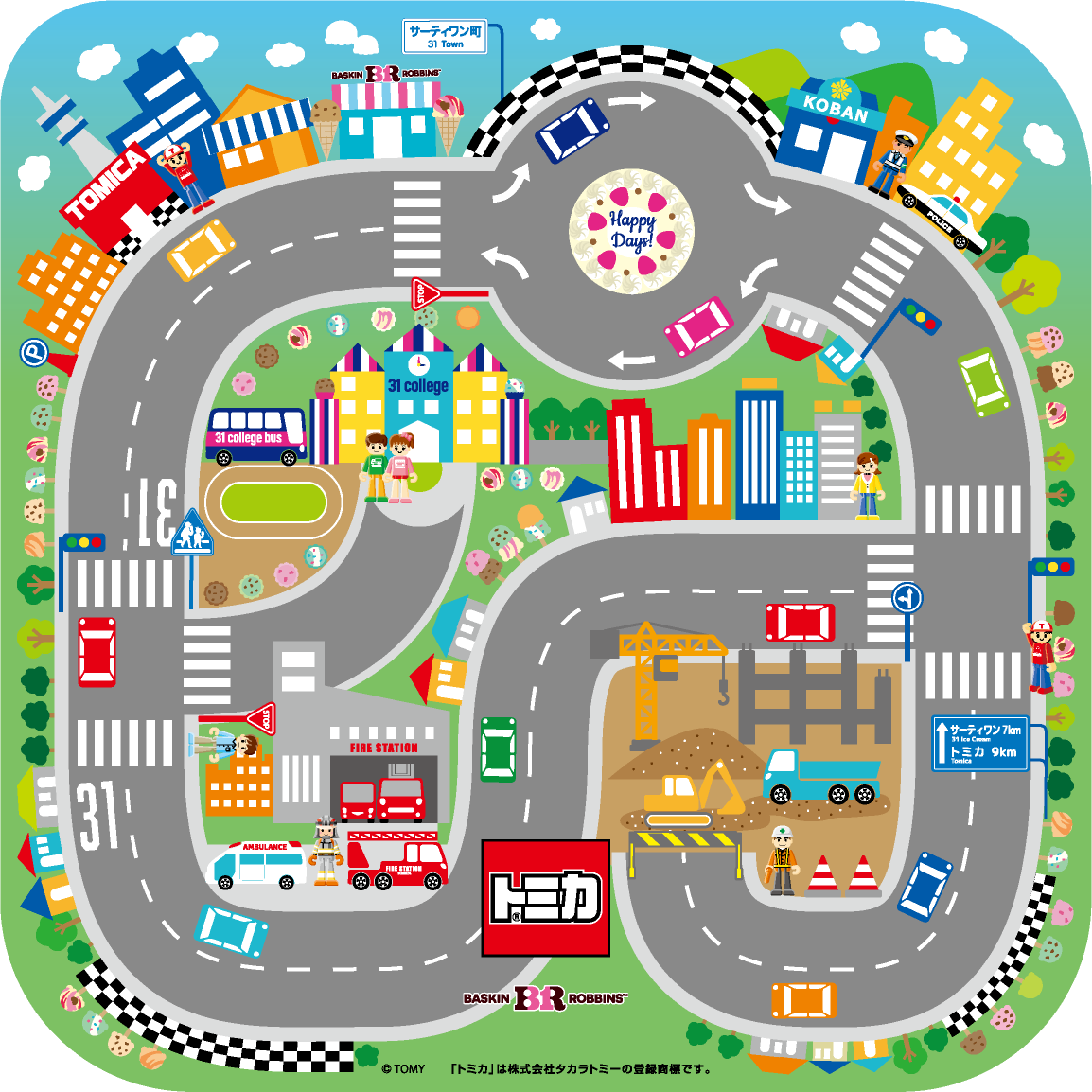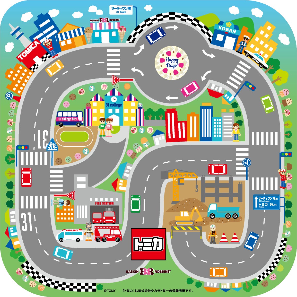 キャンペーントミカ「サーティワン アイスクリーム ポッピングシャワー」トラック付き!はたらく車が大集合した特別なトミカ アイスクリームケーキが新登場!お子様が大好きな街のヒーローである消防車、救急車、パトロールカーがチョコレートに!ホイールローダや信号機、標識、人のピックもついているので、シチュエーションを考えながら自由に飾って、トミカで遊ぶときのワクワクがケーキでも楽しめます。消防車やパトロールカー、工事車両が並んだかっこいいデザインのフィルムや、にぎやかなサーティワンタウンの様子をイメージした台紙は、サーティワンのお店やアイスクリームを持った子どもがいたりと、わくわくするデザインです。フレーバーは大人気のポッピングシャワーとチョップドチョコレート。