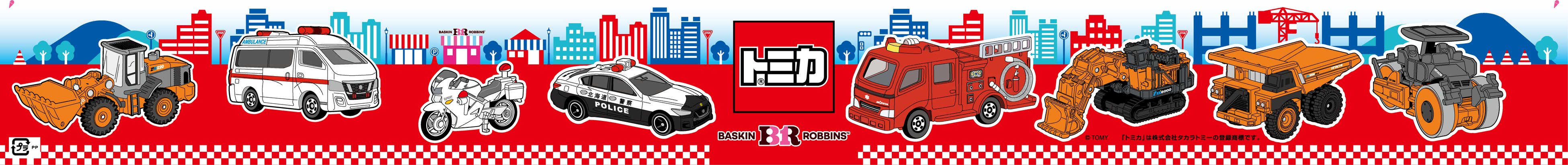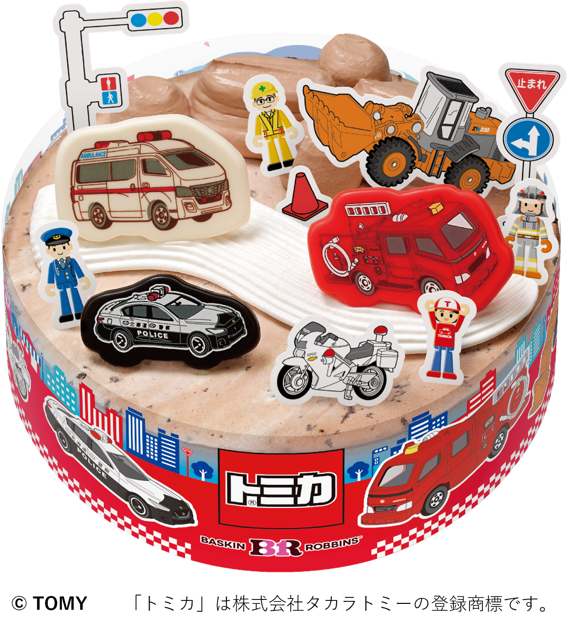 はたらく車が大集合!サーティワンならではの、わいわい楽しいトミカ アイスクリームケーキです。