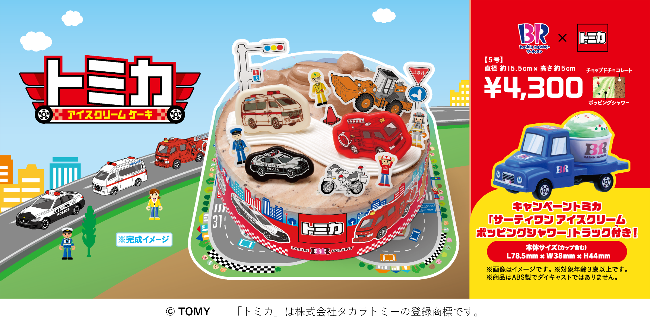 B‐Rサーティワンアイスクリーム株式会社(所在:東京都品川区上大崎3-1-1/代表取締役会長兼社長CEOジョン・キム:東京証券取引所(スタンダード市場):2268)は、2026年4月1日(水)から期間限定で、手のひらサイズのミニカー「トミカ」(発売元:タカラトミー)との初コラボレーション商品を発売します。国内外シリーズ累計販売台数10億台を超え、世代を超えて愛され続けるトミカの世界がそのままアイスクリームケーキになり、はたらく車が大集合!サーティワンだけのトミカタウンをお楽しみください。また本商品にはキャンペーントミカ「サーティワン アイスクリーム ポッピングシャワー」トラックが1台付属します。