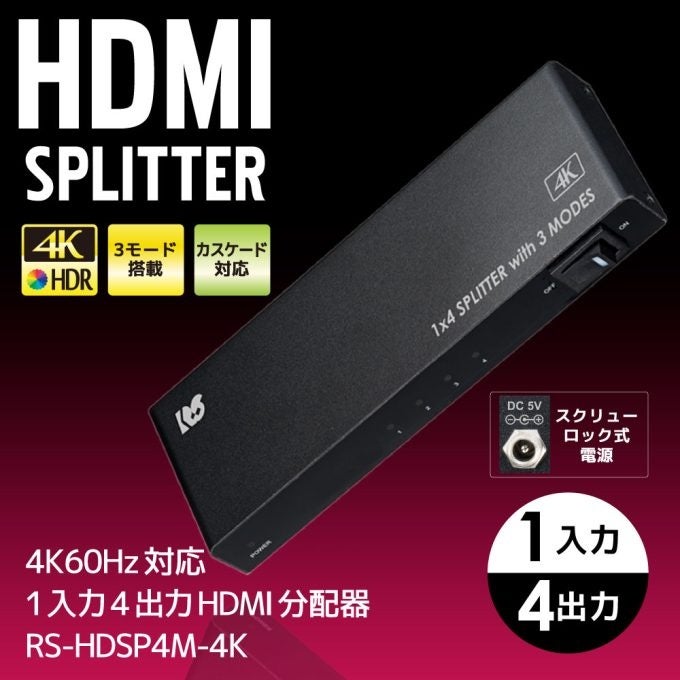 4K60Hz対応1入力4出力HDMI分配器(動作モード機能付)RS-HDSP4M-4K