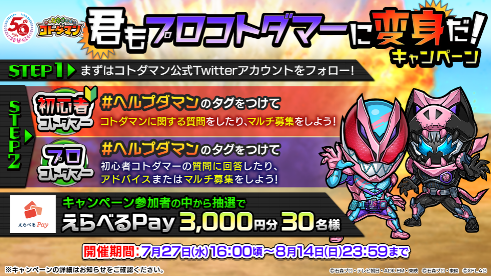 コトダマン公式Twitterアカウントをフォローし、「#ヘルプダマン」を付けてコトダマンに関する質問やアドバイス、マルチプレイ募集などに関する投稿をすると「えらべるPay」3,000円分が30名様に当たります。