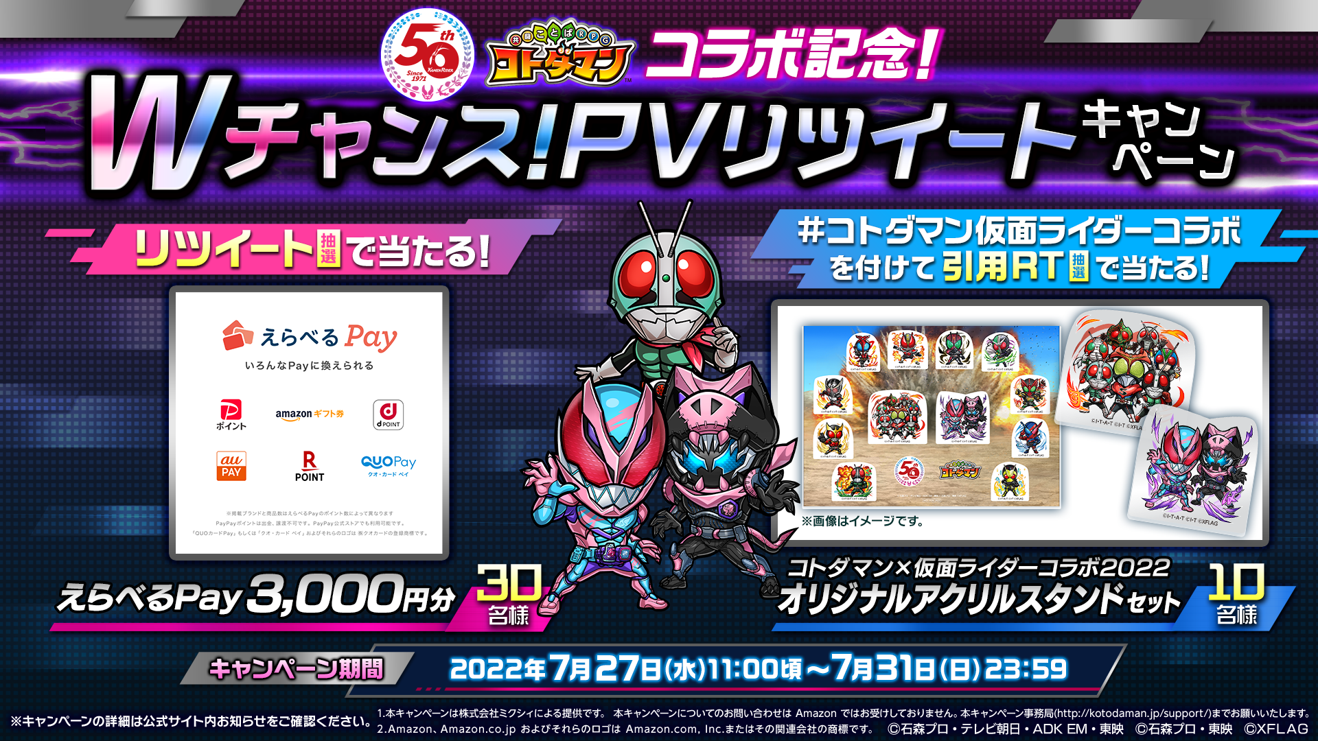 7月27日(水)11:00頃より、本コラボの開催を記念して各コラボキャラクターの紹介や「すごわざ」発動時のアニメーションを収録したコラボ記念スペシャルPVを公開します。また、PVが添付されたキャンペーン対象ツイートをリツイートした方の中から抽選で30名様に3,000円分の「えらべるPay」が当たるTwitterキャンペーンを同日より実施します。さらに、キャンペーン対象ツイートにハッシュタグ「#コトダマン仮面ライダーコラボ」を付けて引用リツイートすると抽選で10名様に「コトダマン×仮面ライダーコラボ2022 オリジナルアクリルスタンドセット」も当たります。本キャンペーンの応募方法など詳細については、コトダマン公式サイトまたは応募規約をご確認ください。
