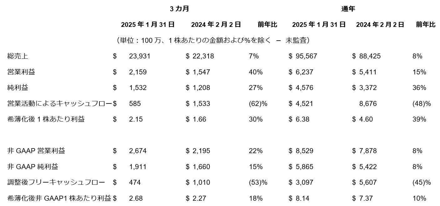 ・2026会計年度第1四半期(2025年2月~2025年4月)の売上高は225億から235億ドル、中間値で前年同期比3%増の230億ドルと予測