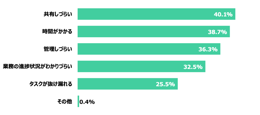 ・タスク管理に課題が「ある」と6割以上が回答。課題の内訳として、「共有しづらい」、「時間がかかる」、「管理しづらい」という悩みがあることが浮き彫りに。