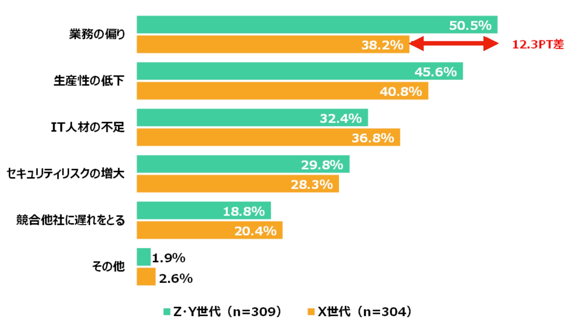 ・「デジタルディバイド」を感じた経験が「ある」と回答した人は、「業務の偏り」、「生産性の低下」を実感。Z・Y世代に業務が偏っている実態も明らかに。