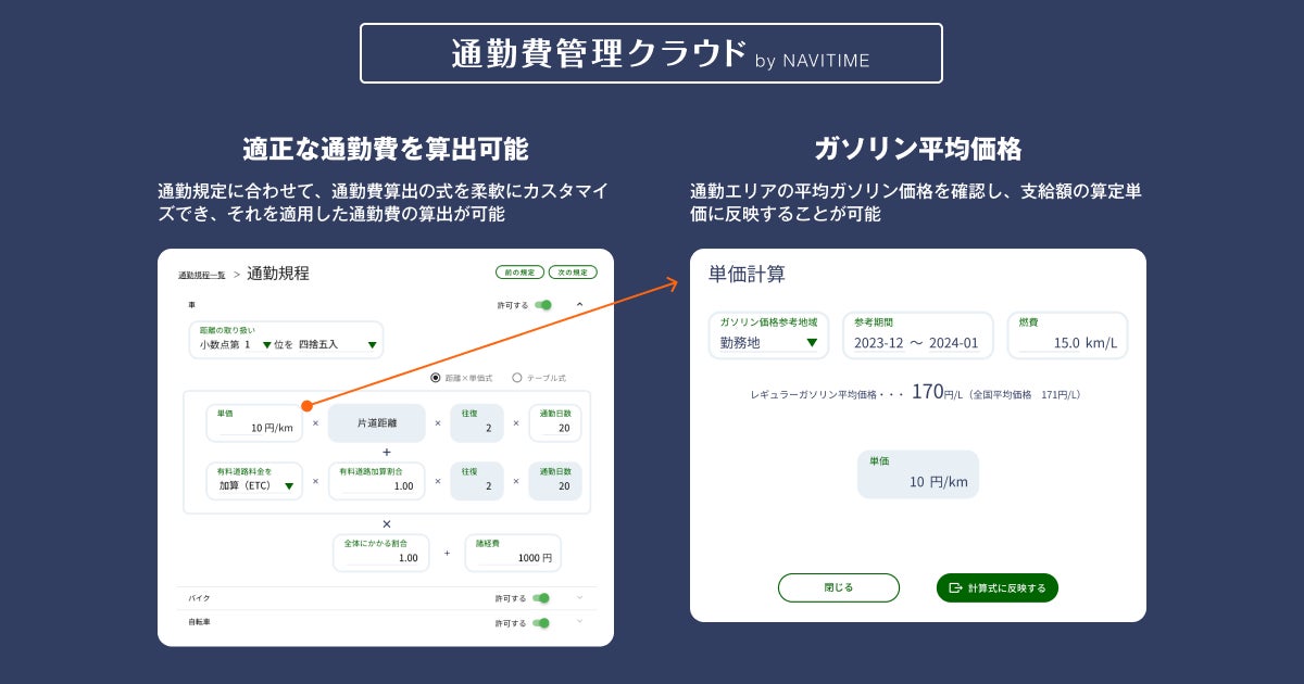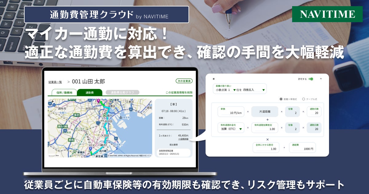 株式会社ナビタイムジャパン(代表取締役社長:大西啓介、本社:東京都港区)は、2024年1月25日(木)より、従業員の正確な通勤費をシステム管理できるWebサービス『通勤費管理クラウド by NAVITIME』にて、マイカー通勤に対応します。