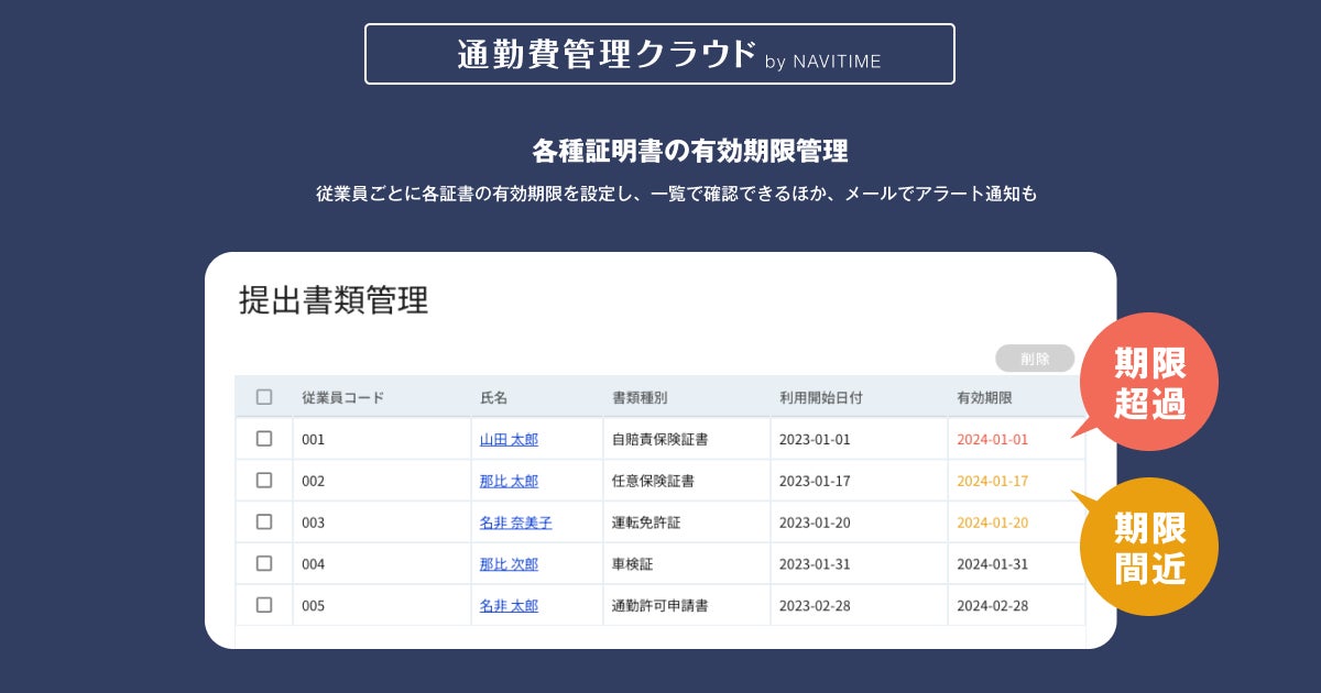 車とバイクの通勤費については、通勤日数・有料道路料金の扱い・全体にかかる割合・諸経費なども考慮できる「距離×単価式」、もしくは、距離に応じた手当支給額を自由にカスタマイズできる「テーブル式」から選択できるので、各社の通勤費規定にあった柔軟な設定が可能です。さらに、社員一人ひとりの自賠責保険証書や運転免許証、車検証などの有効期限も登録でき、期限が近付いたことを知らせるメール通知機能も搭載しています。通勤費の管理だけでなく、安全運転や法令順守のサポートもできればと考えております。