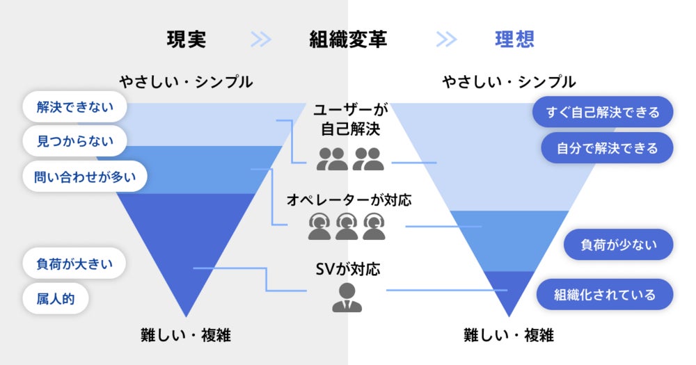 下図のように、サポート業界によくあるオペレータとスーパーバイザーに過度な負荷がかかっている状況から脱し、サポート活動を効率的に組織化していくために、KCSは非常に効果的です。