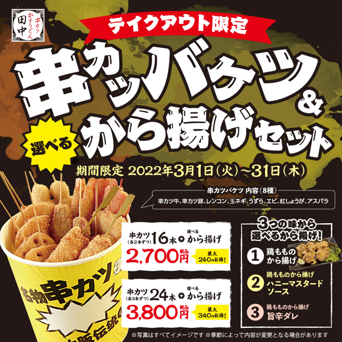 【テイクアウト限定】大人気の2つがセットに!串カツバケツ&から揚げセット~から揚げはその日の気分で!嬉しい選べる3種類~