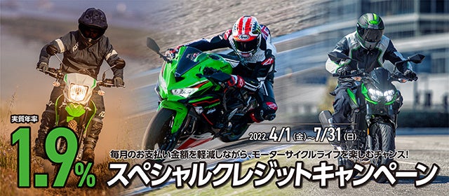 株式会社カワサキモータースジャパン(本社:兵庫県明石市、代表取締役社長:桐野 英子)は、期間中、カワサキ正規取扱店で対象モデルをご購入の際に実質年利1.9%の特別金利にてご利用いただけるスペシャルクレジットキャンペーンを4月1日より実施いたします。