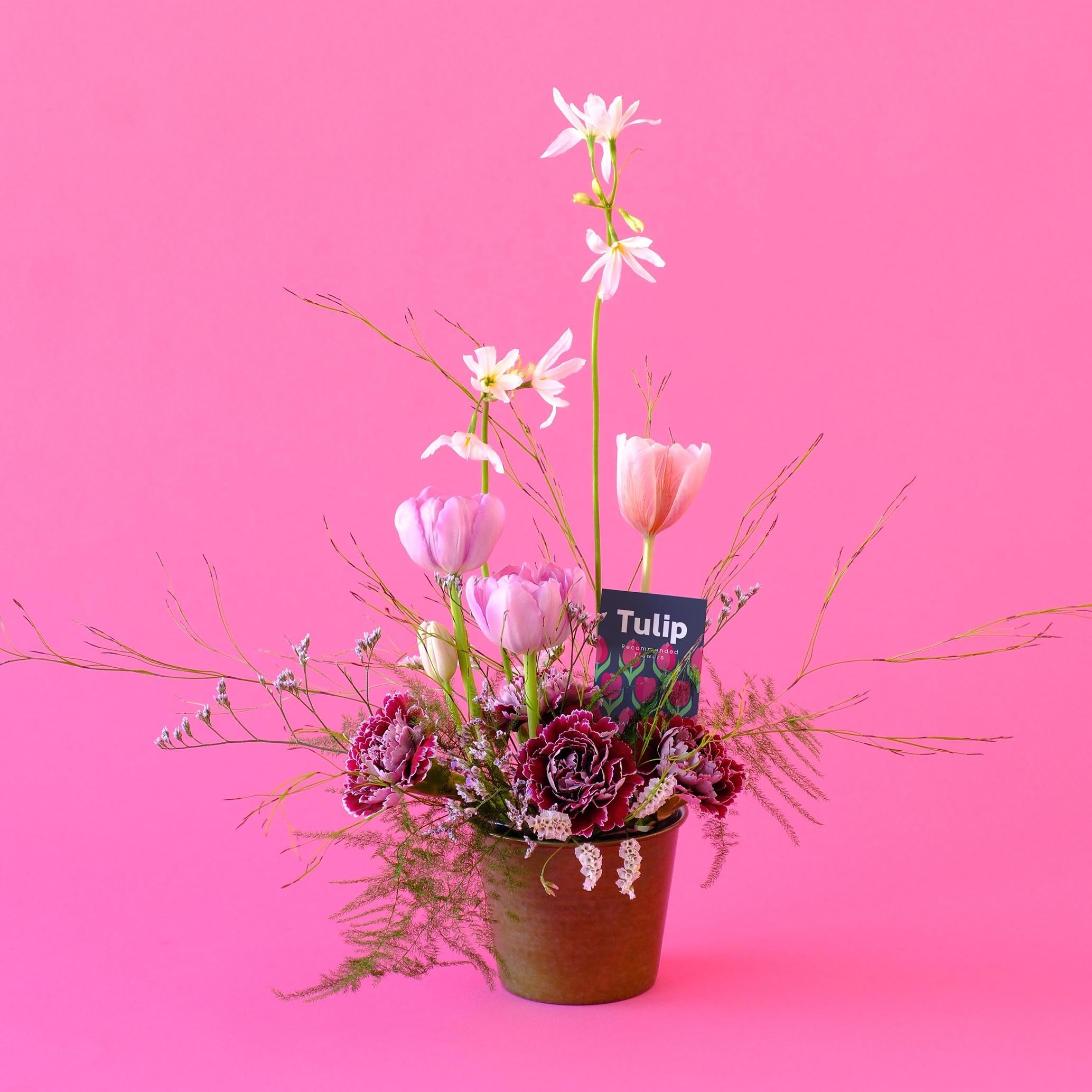 ショップおすすめのチューリップをナチュラルなアレンジメントに仕上げました。器付きでそのまま飾って楽しめます。