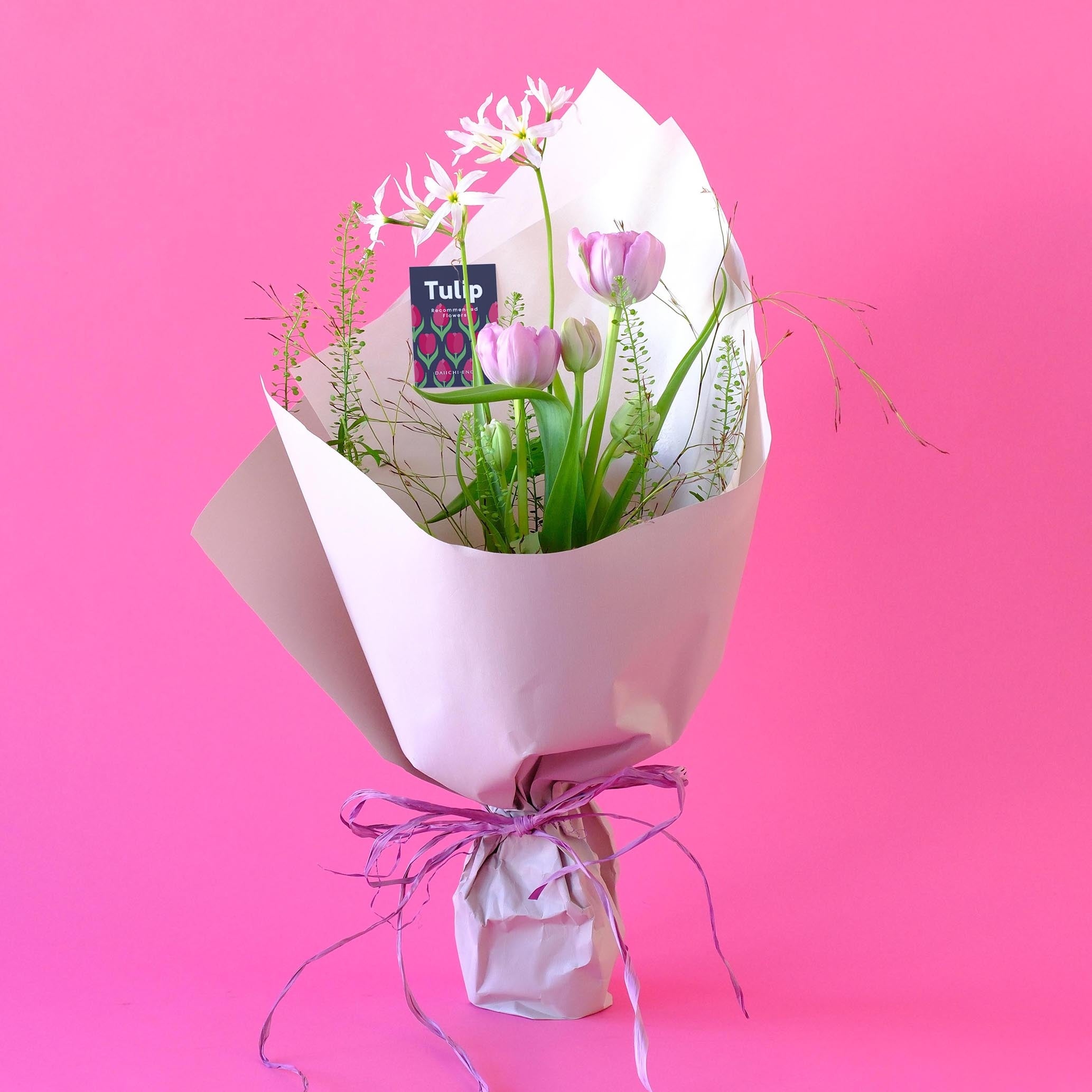 ショップおすすめのチューリップをシンプルなブーケに仕上げました。コンパクトなサイズでちょっとしたギフトやご自宅用にもおすすめです。