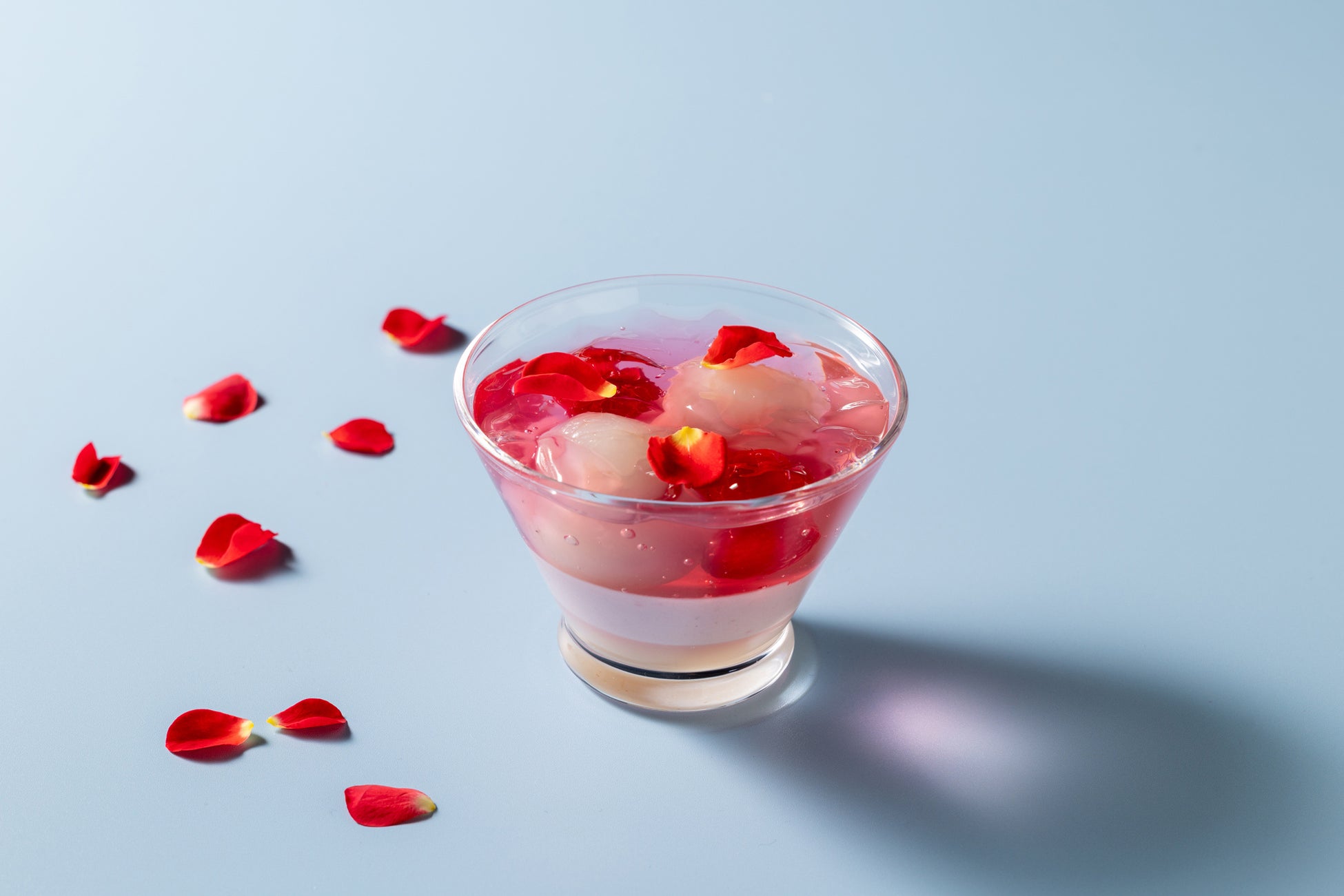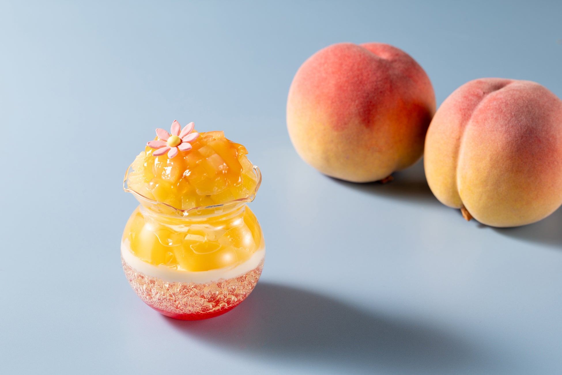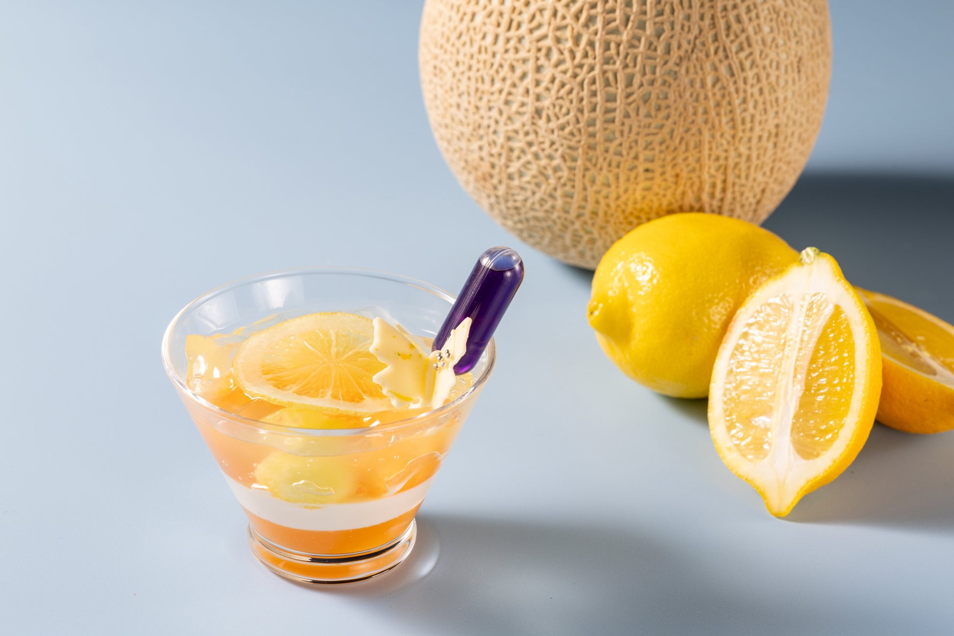 甘酸っぱいハニーレモンゼリーと、芳醇で豊かな甘みが広がるメロンを組み合わせました。食べ進めていくと現れる杏仁豆腐やメロンジュレと合わせてお召し上がりください。スポイトに入れたバタフライピーシロップをゼリーにかけると、美しい紫に変わる色の変化もお楽しみいただける、シェフの遊び心があふれるグラススイーツです。