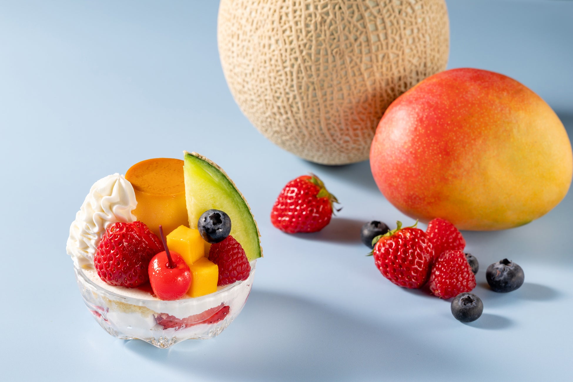 自家製のベリーシロップをたっぷりとしみ込ませるストロベリーショートケーキの上に、プリンや生クリーム、さくらんぼ、メロン、マンゴーなどのサマースイーツを盛り付けます。卵の風味がやさしく広がる少し硬めのプリンがどこか懐かしい昭和レトロなプリンアラモードをお楽しみください。