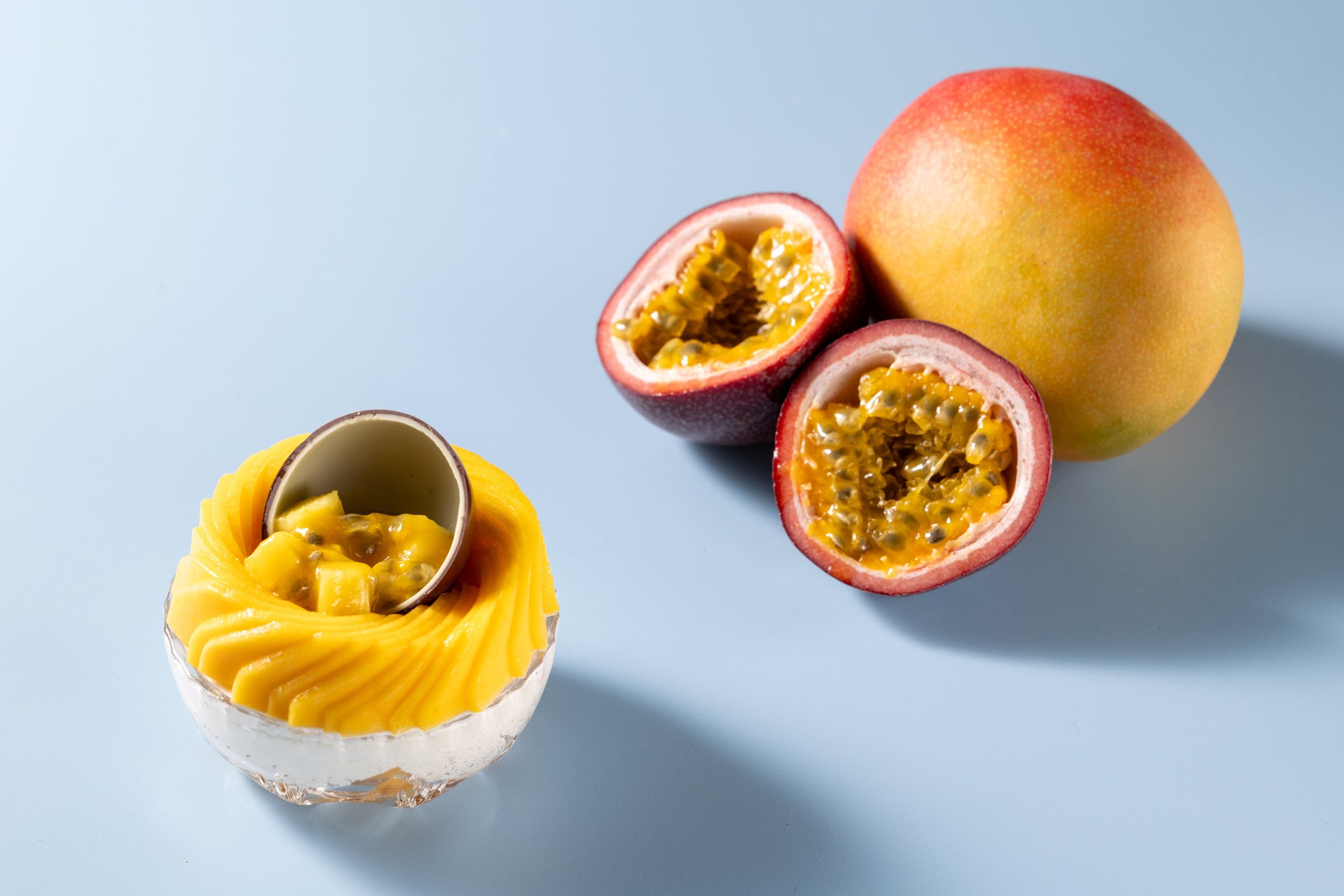 マンゴーやパッションフルーツをあわせたシロップをしみ込ませたスポンジと、なめらかなクレームダンジュを重ねてつくる、エキゾチックな味わいのティラミスがベースの新作です。トップにはパッションフルーツの皮に見立てたチョコレートの中に、パッションフルーツとパイナップルを入れて飾ります。グラスの縁に沿うように美しく折り重ねるフレッシュなマンゴーが目を引く一品です。