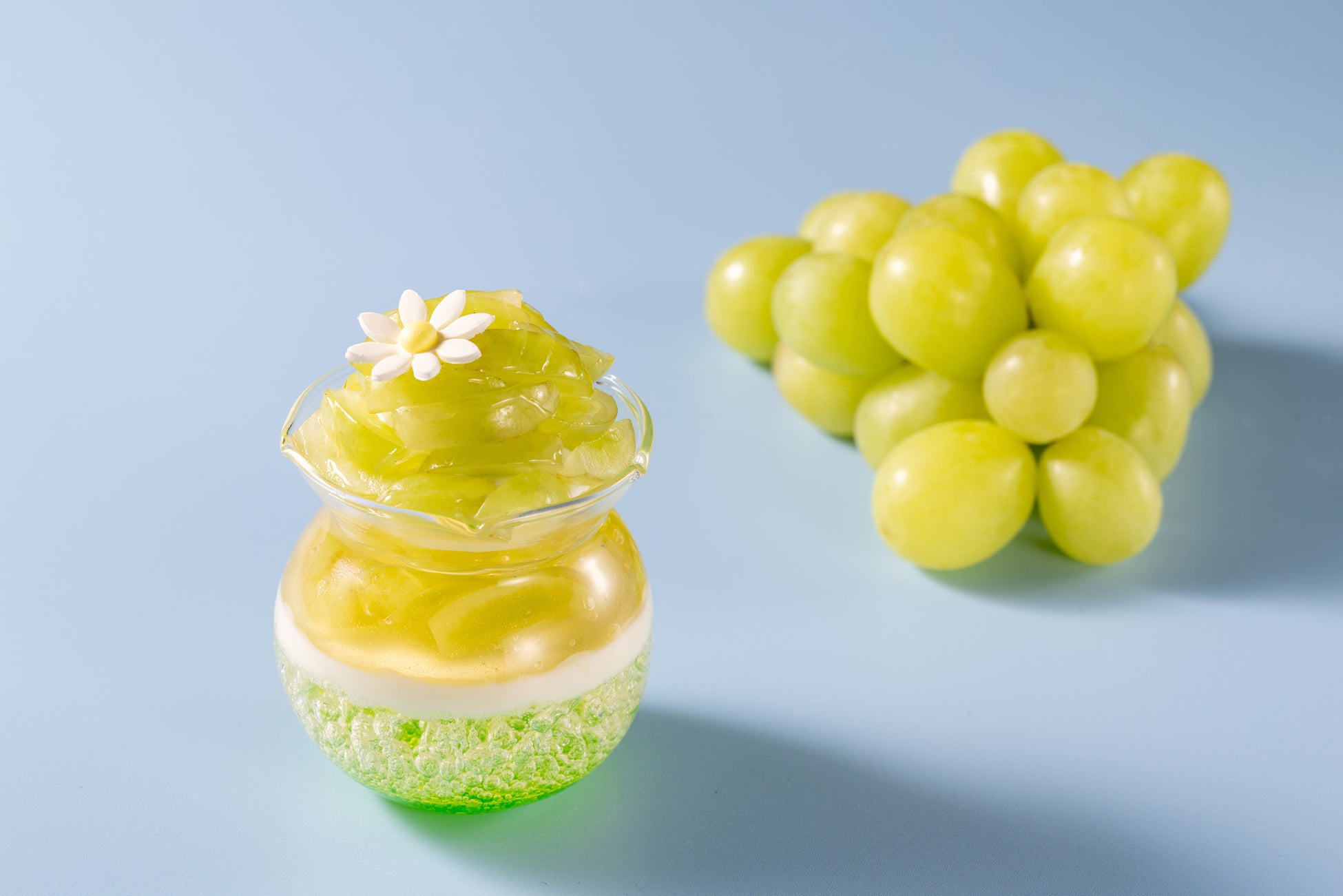 フレッシュなシャインマスカットとノンアルコールのシャルドネのスパークリングワインのゼリー、クリーミーなレアチーズムースを層にする夏の定番ベリーヌです。今夏は口当たりなめらかなリコッタチーズのムースをトップに加え、コク深さを増して登場します。シャインマスカット、ゼリー、ムースが織りなすハーモニーをご堪能ください。
