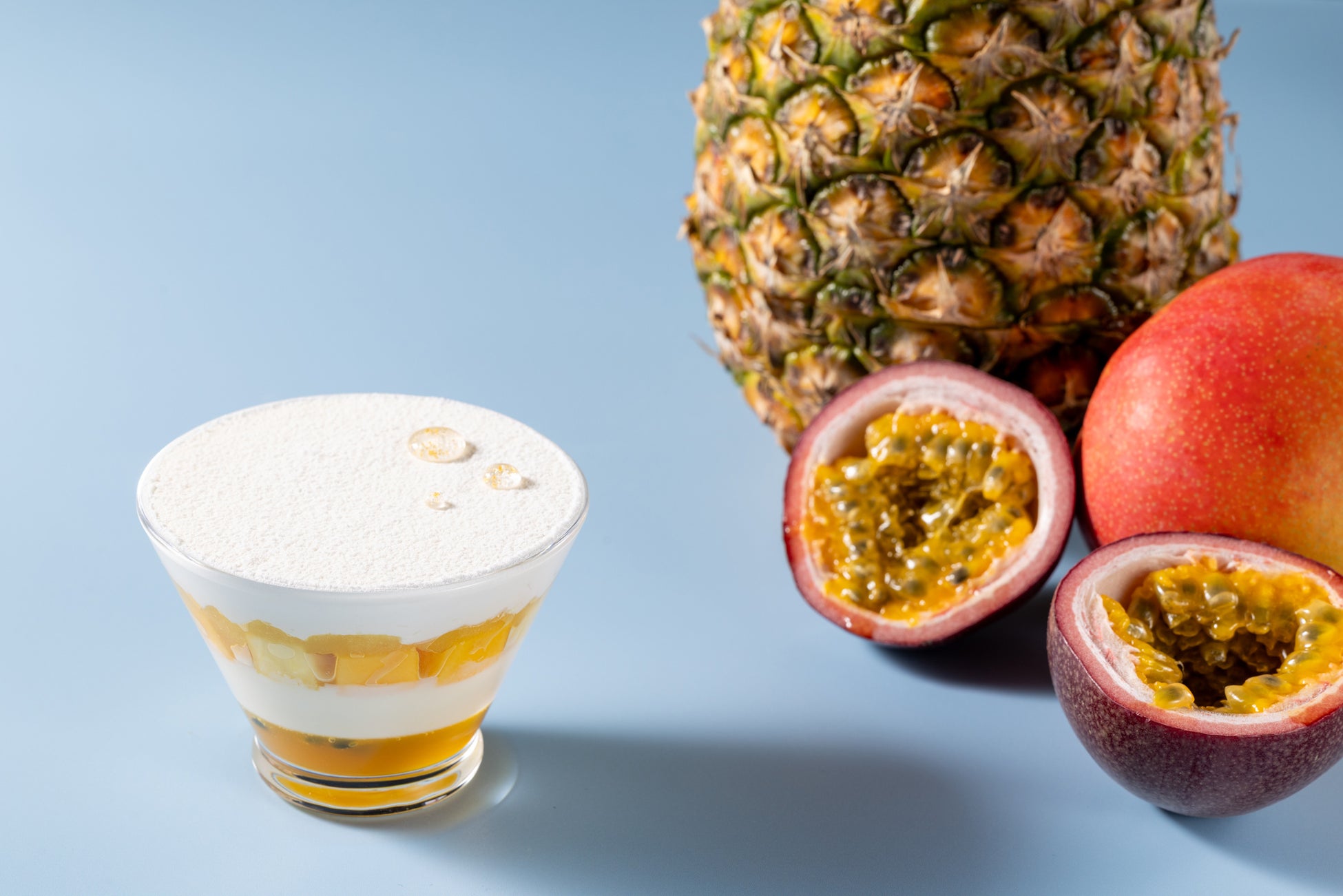 グラスの底からパイナップルとパッションフルーツのジュレ、レアチーズムース、フレッシュマンゴーとパイナップル、生クリームを丁寧に重ねます。甘さ控えめの生クリームとほんのり酸味のあるレアチーズのムースが、トロピカルフルーツの濃厚な甘みを引き立たせます。表面に施す金箔入りの雫と、ホワイトとイエローのレイヤーが美しい新作です。