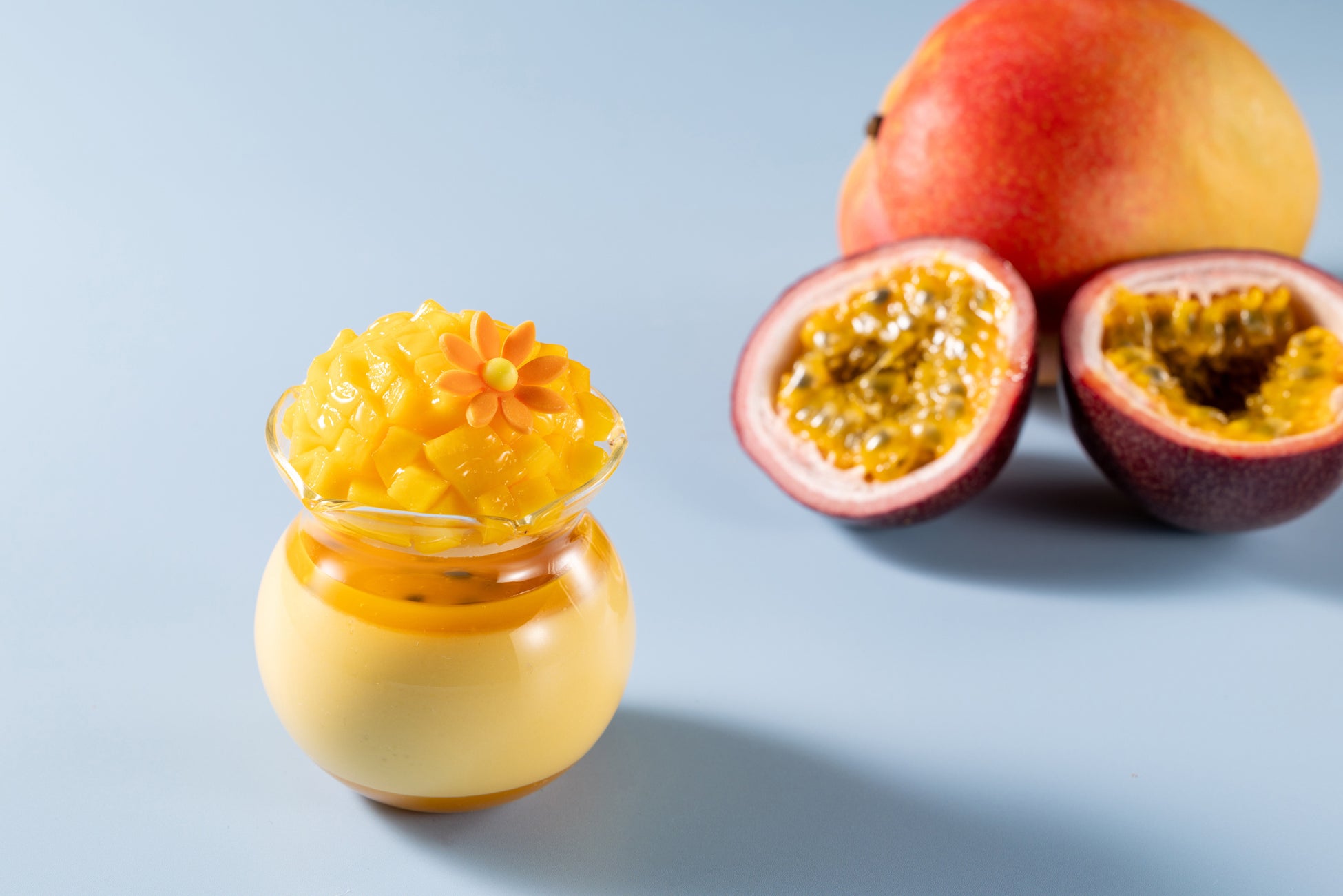 なめらかな食感のマンゴープリンに、濃厚なマンゴージュレと甘酸っぱいパッションフルーツソースをあわせます。トップには、ココナッツムースと小さくカットしたフレッシュマンゴーを華やかにトッピング。今年はマンゴージュレとココナッツムースを増量し、より一層トロピカルな味わいを感じるマンゴープリンに仕上げます。