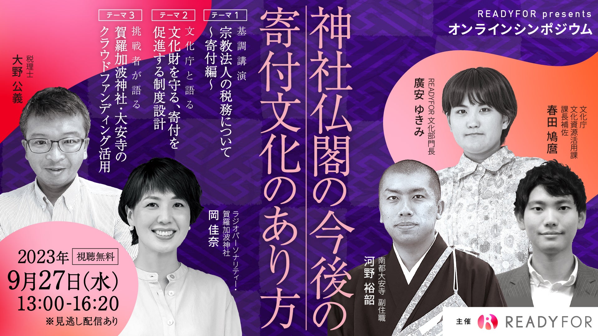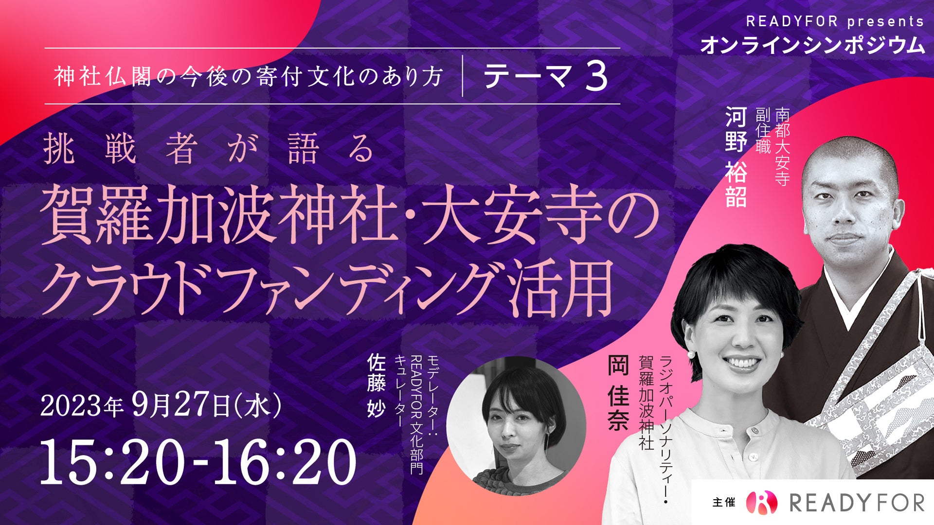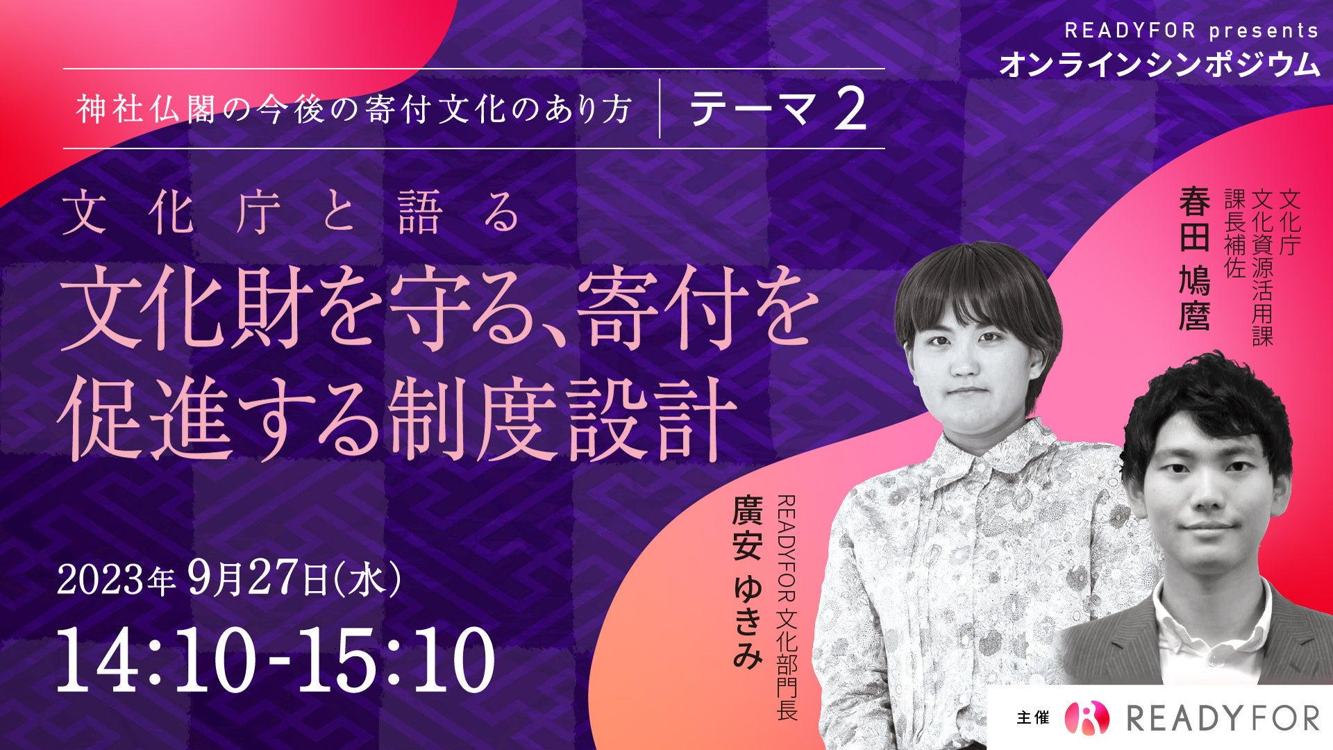 日本初・国内最大級のクラウドファンディングサービス「READYFOR」を運営するREADYFOR株式会社は、2023年9月27日(水)にオンラインシンポジウム「神社仏閣の今後の寄付文化のあり方」を開催いたします。