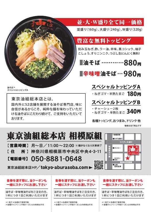 今回、全国初のコラボ出店を記念し、2023年3月31日(金)、4月1日(土)の2日間、「油そば」ワンコイン500円(税込)、「辛味噌そば」600円(税込)の特別価格 でお召し上がりいただけるオープニングキャンペーンを実施いたします! 東京油組総本店の油そばをまだ召し上がったことがない方は、ぜひこの機会に一度お試しください!※並盛り・大盛り・W盛り全て同一価格(東京油組総本店 相模原組のみで実施)