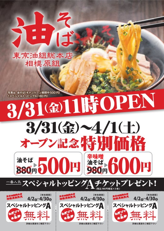 ~ 3月31日(金)・4月1日(土)の2日間、油そば・辛味噌油そばを特別価格でご提供!~
