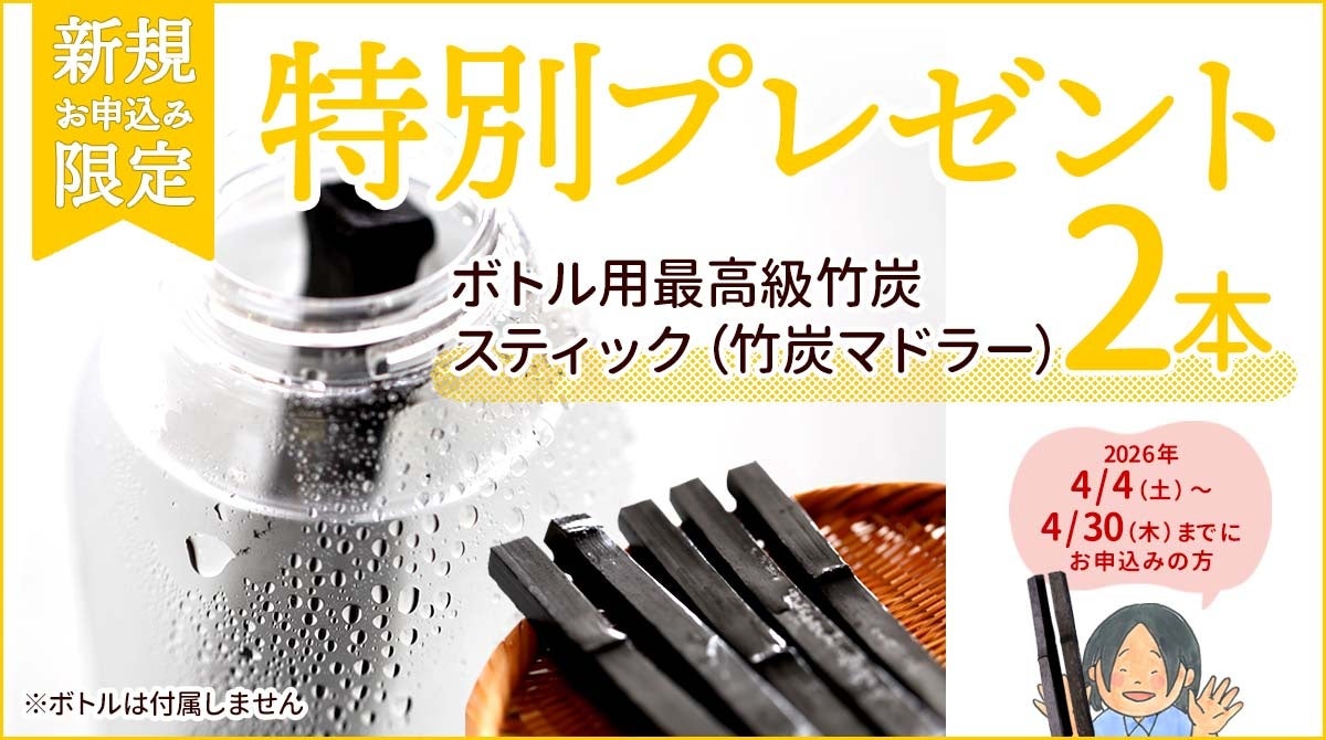 創業明治27年(1894年)より竹材・竹製品製造卸業として皆様にご愛顧いただいている竹材専業メーカーである、虎斑竹専門店 竹虎(運営:株式会社山岸竹材店)は、このたび新たに「定期購入サービス」をお申し込みいただいたお客様を対象に、「最高級竹炭スティック(竹炭マドラー)」2本セットをプレゼントするキャンペーンを開始いたします。