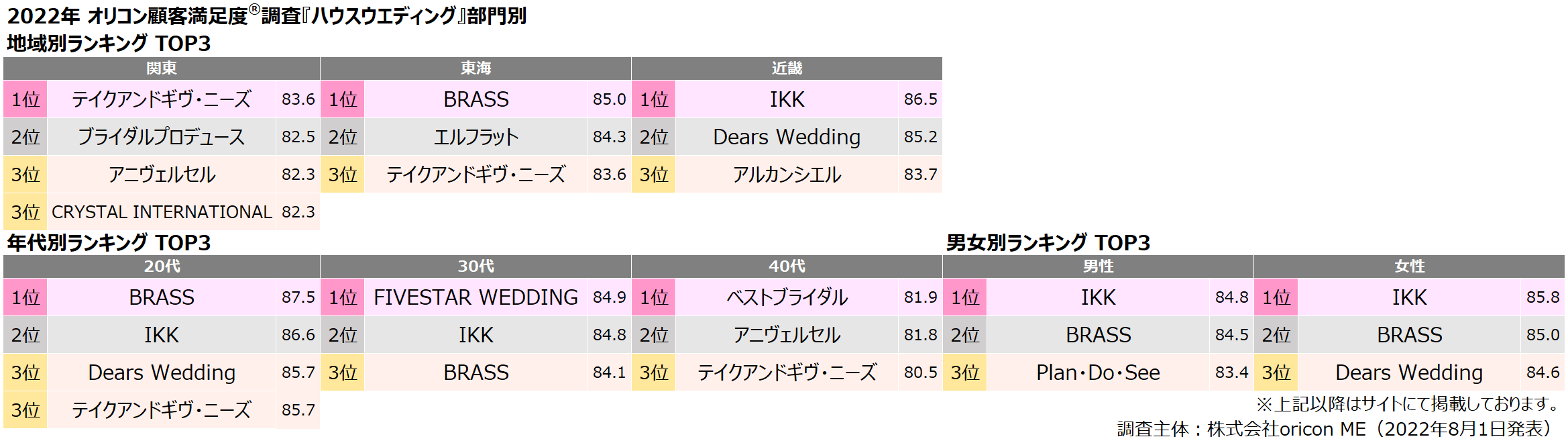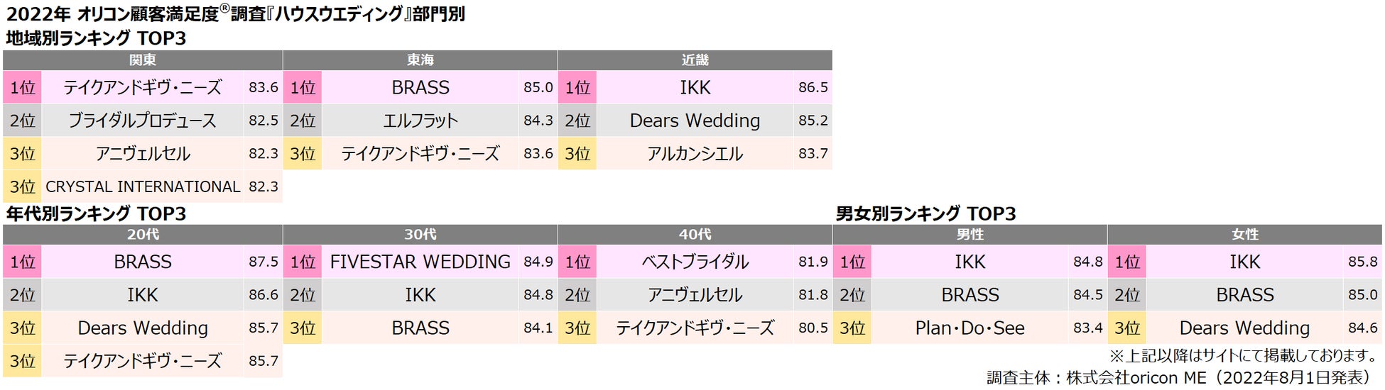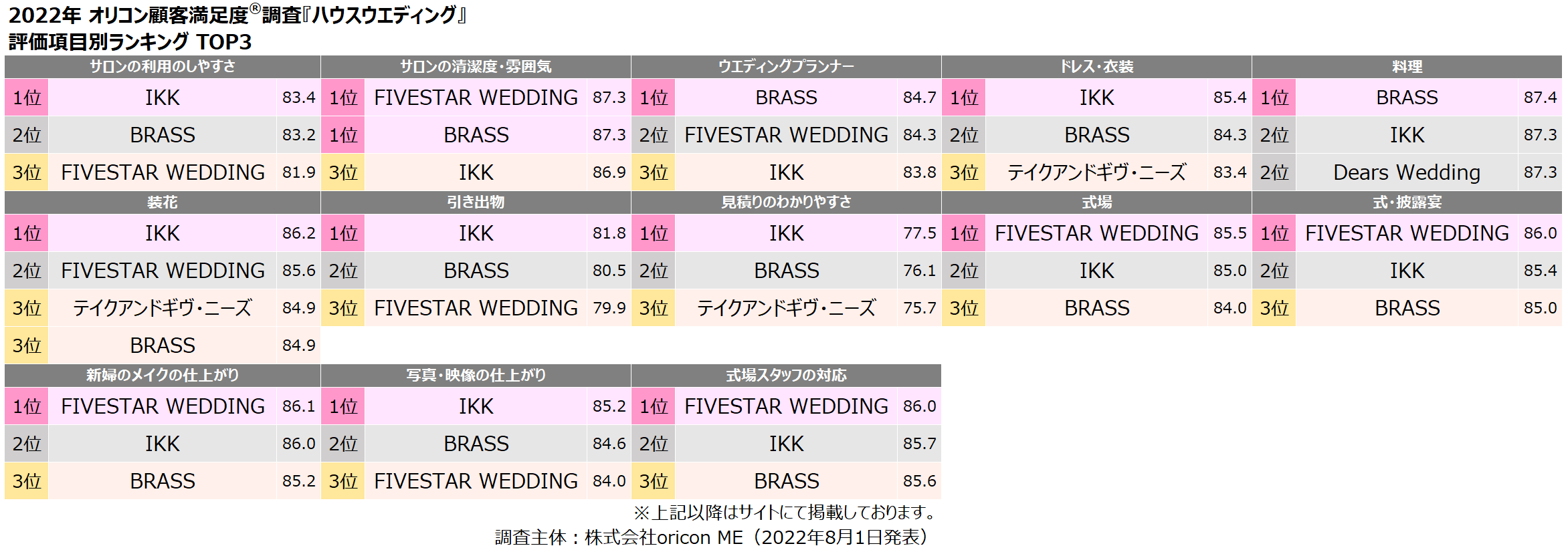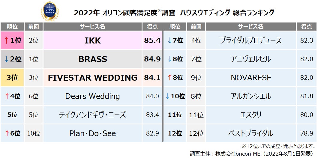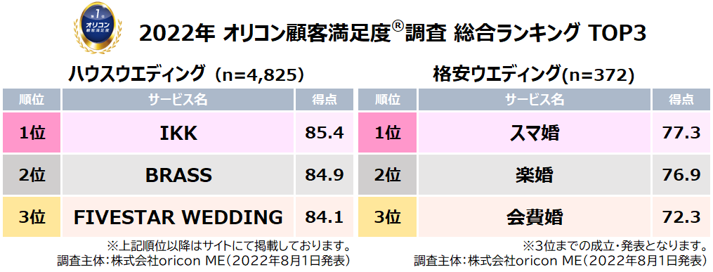 2022年 満足度の高いウエディング関連ランキング┃『ハウスウエディング』【IKK】が初の総合1位、『格安ウエディング』は【スマ婚】が2017年の調査開始以来初の総合1位~オリコン顧客満足度®調査