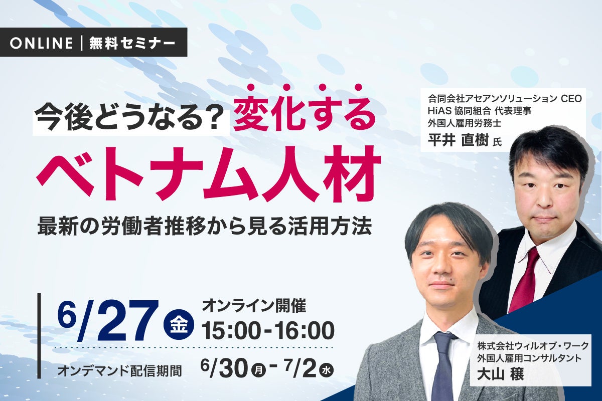 ウィルグループの総合人材サービスを手掛ける株式会社ウィルオブ・ワーク(本社:東京都新宿区、代表取締役社長:村上 秀夫)は、無料オンラインセミナー『今後どうなる?変化するベトナム人材 最新の労働者推移から見る活用方法を徹底解説』を、2025年6月27日(金)に開催します。