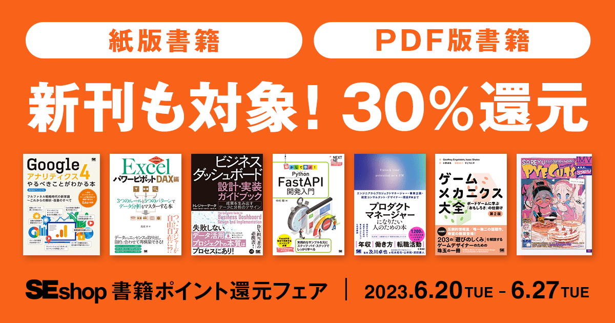 SEshopは、IT書・ビジネス書をはじめ、資格書や実⽤書まで幅広いラインナップを展開する翔泳社の公式通販サイトです。6月27日(⽕) まで、紙版もしくはPDF版の書籍を購入すると、本体価格の30%をポイント還元するキャンペーンを開催します。貯まったポイントは1ポイント=1円として次回のお買い物から使えます。新刊含む2600タイトルが対象です。また、紙版書籍は送料無料でお届けします。