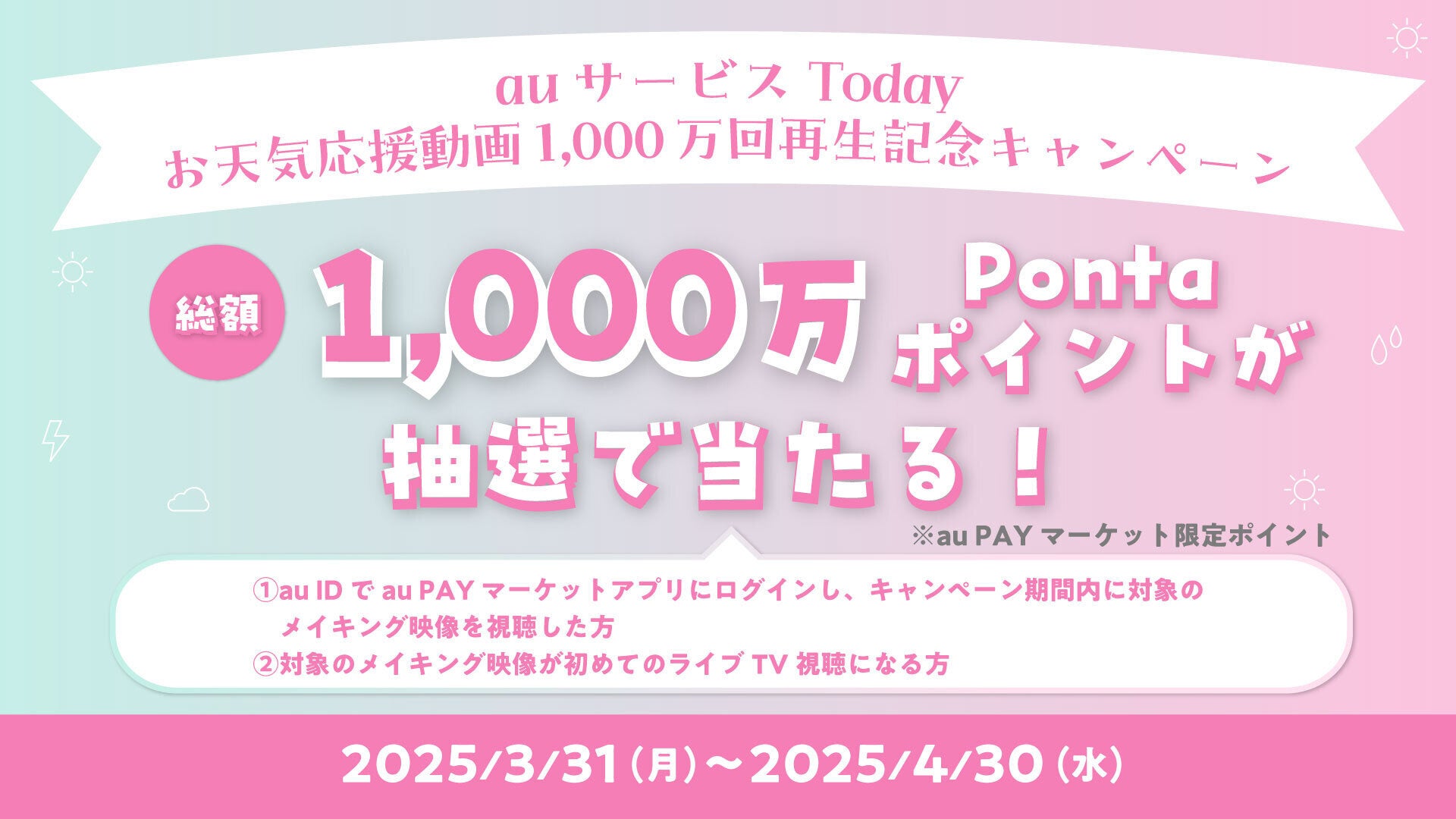 初めてライブTVをご視聴のお客さまでメイキング映像を視聴したお客さまを対象に、抽選で総額1,000万Pontaポイント(au PAY マーケット限定)があたるキャンペーンを開催します。